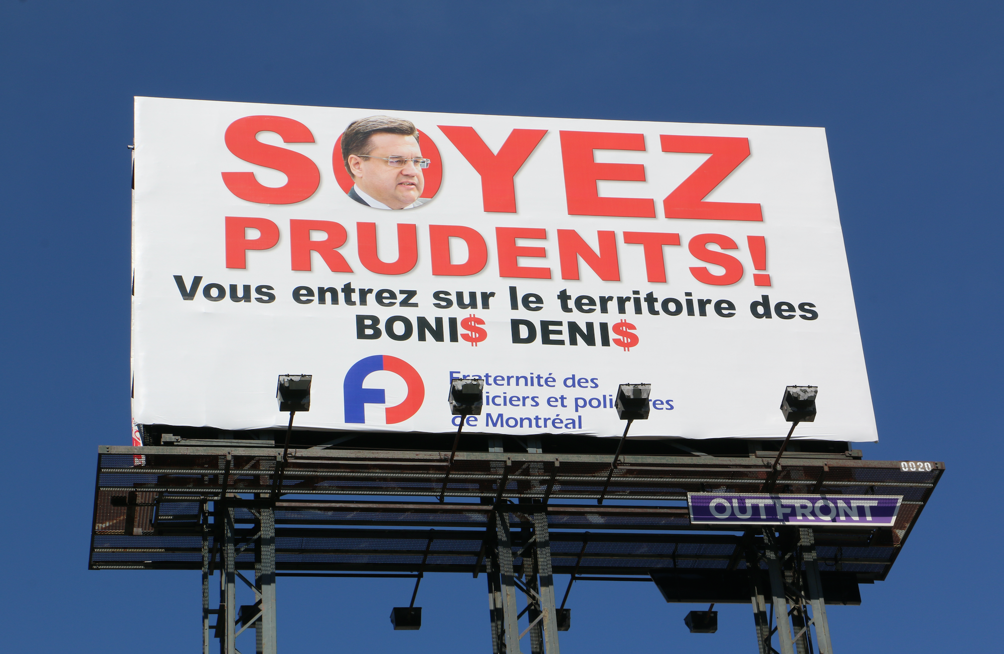 Depuis mercredi matin, quatre panneaux publicitaires payés par la Fraternité des policiers de Montréal rappellent – de manière ironique – aux automobilistes de rouler prudemment. «Vous êtes sur le territoire des Boni$ Deni$», peut-on lire sur les affiches, une référence aux quotas de contravention imposés aux policiers par l’administration municipale