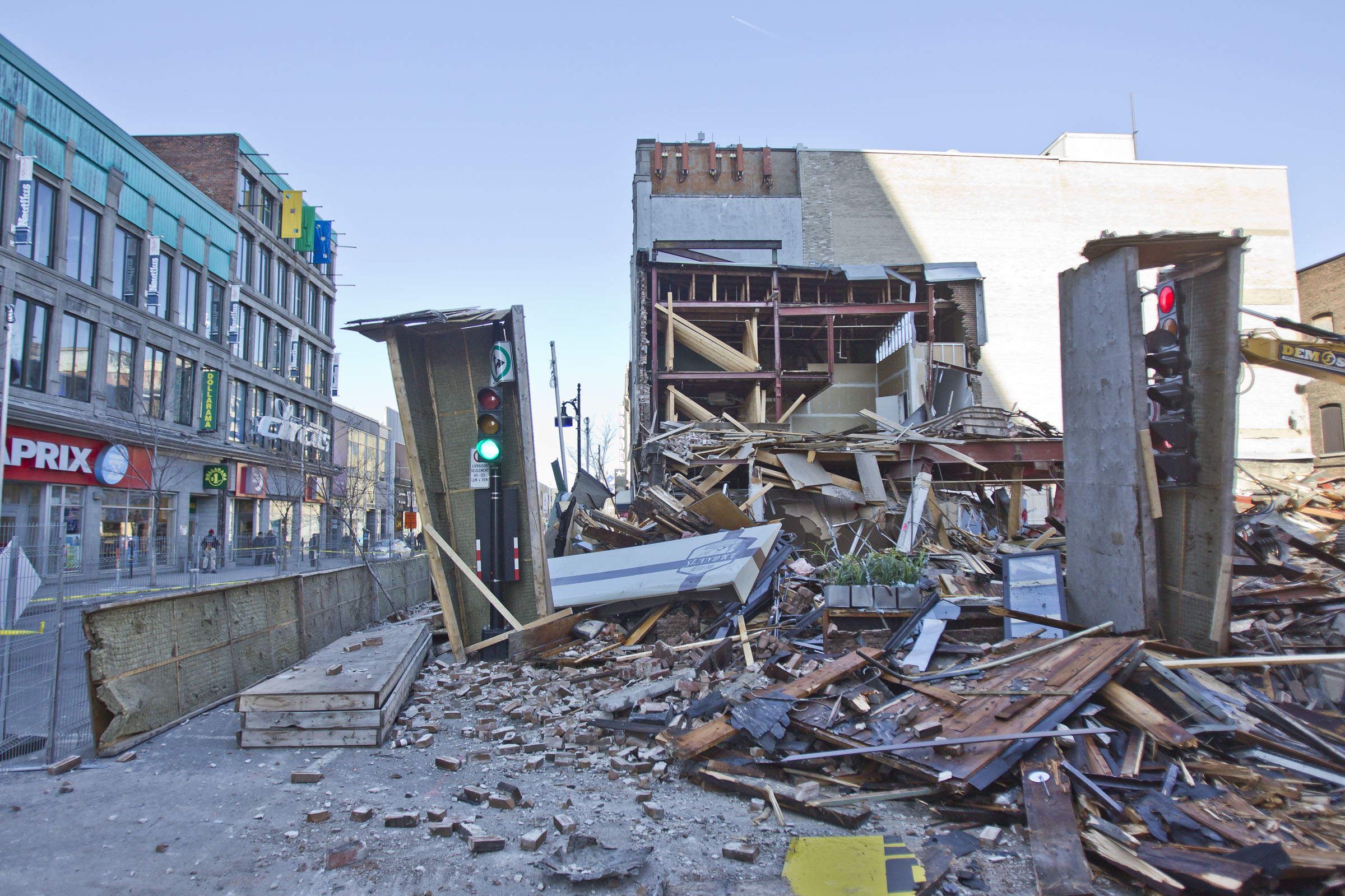 «Durant la démolition, une partie du bâtiment est tombée à un endroit imprévu en se défaisant», a expliqué à Métro le chef aux opérations du Service de sécurité incendie de Montréal (SIM), Martin Guilbault. Les gravats ne se seraient toutefois pas répandus au-delà du périmètre de sécurité initialement prévu pour les travaux.