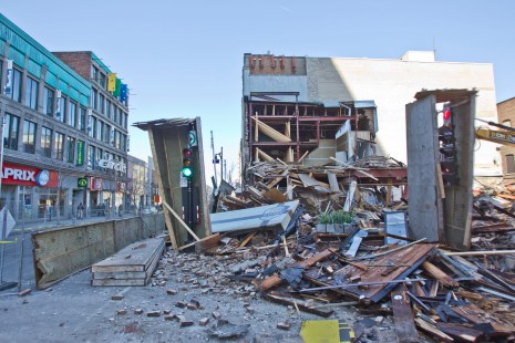 Une portion d’un bâtiment en démolition situé à l’angle des rues Sainte-Catherine et Saint-André s’est effondrée mardi après-midi dans l’arrondissement de Ville-Marie à Montréal.