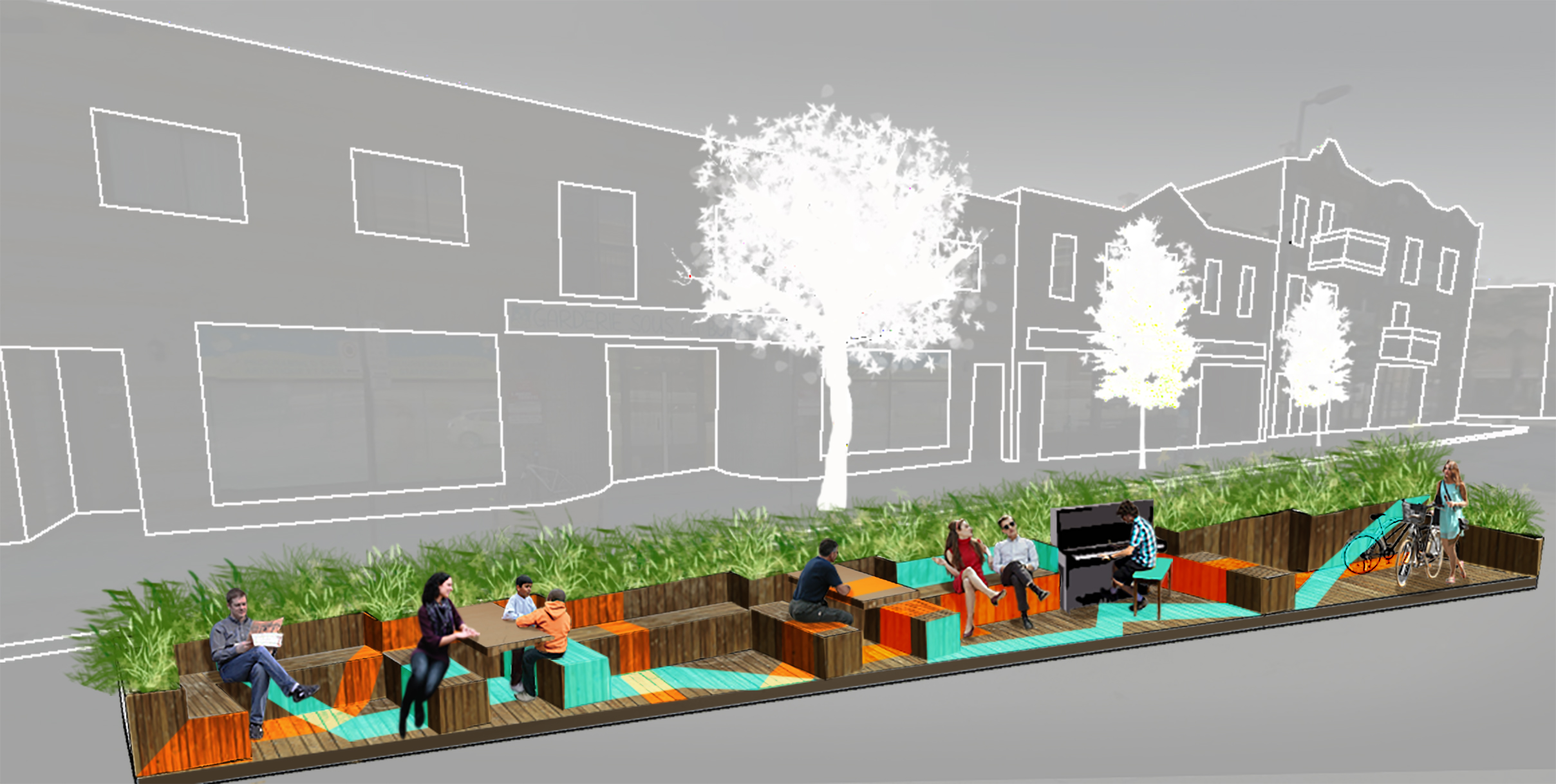 Le placottoir sera installée dans la rue, nécessitant le retrait de trois espaces de stationnements. Il comprendra bancs, tables et supports à vélo. On y trouvera même un piano public.