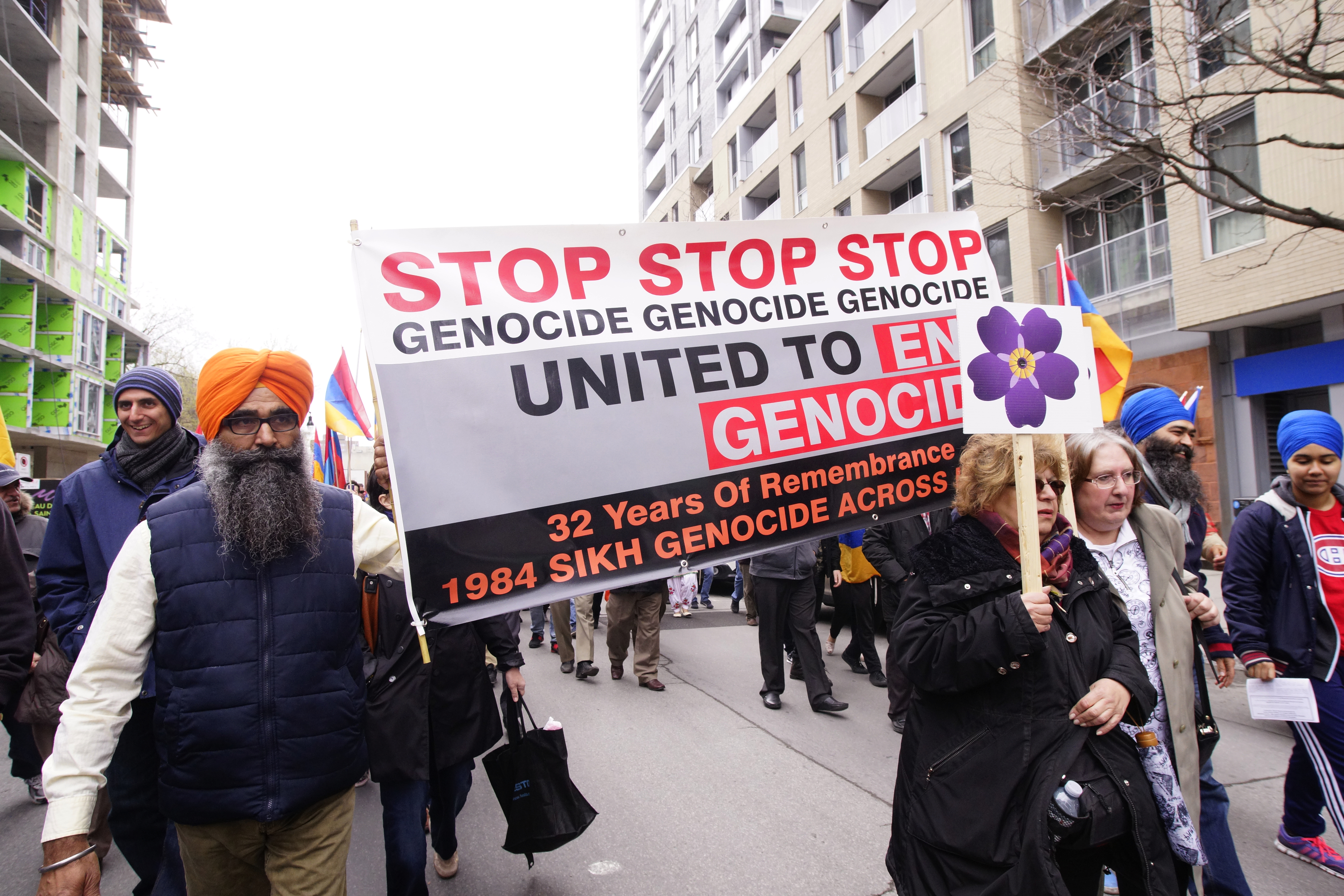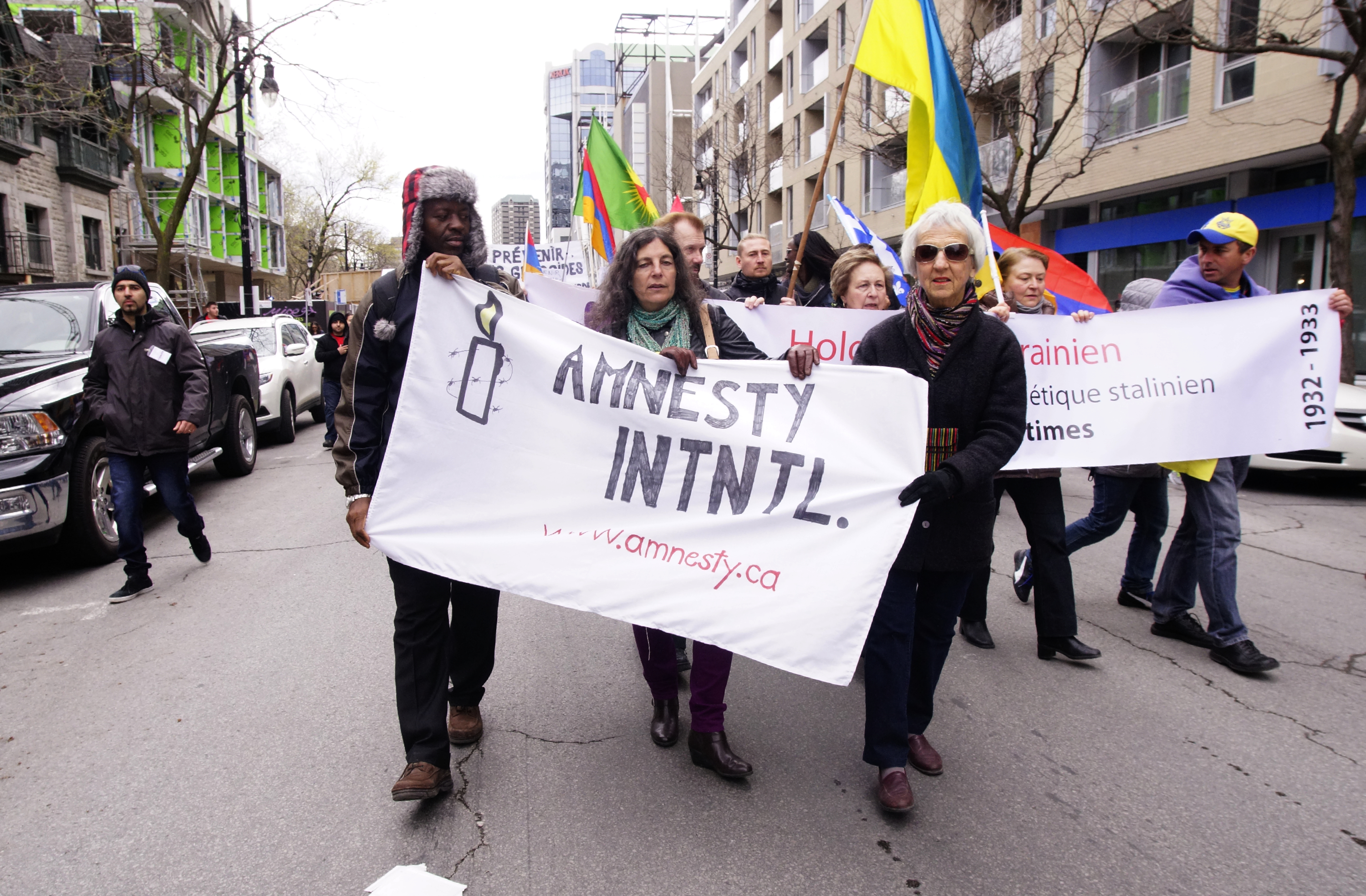 Des dizaines et des dizaines de drapeaux arméniens et quelques drapeaux rwandais, israéliens et ukrainiens ont flotté dimanche au dessus de la rue Sainte-Catherine, entre l’avenue Atwater et la Place des Arts, à l’occasion de la Marche pour l’humanité et la prévention des génocides.