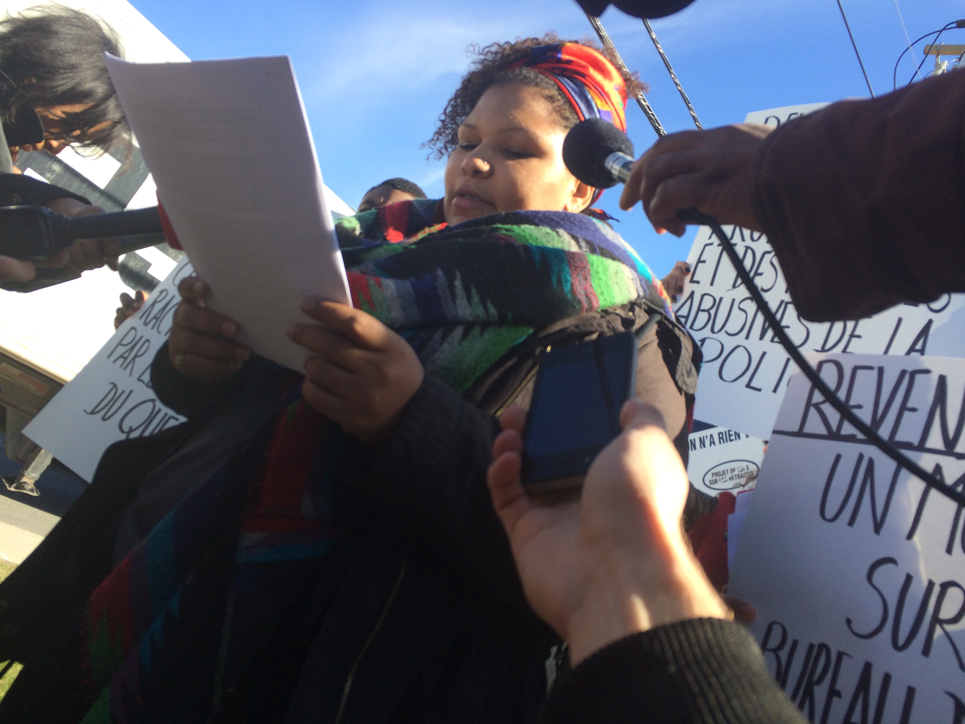 Déjà présente le 20 avril devant le poste de quartier 39 en compagnie de Montréal-Nord Republik, Stella Jetté, membre du groupe Montréal-Noir, a demandé à nouveau la fin du profilage racial dans l’arrondissement ainsi qu’une transparence sur l’enquête policière visant l’intervention des forces de l’ordres sur la rue Arthur-Chevrier le 31 mars.