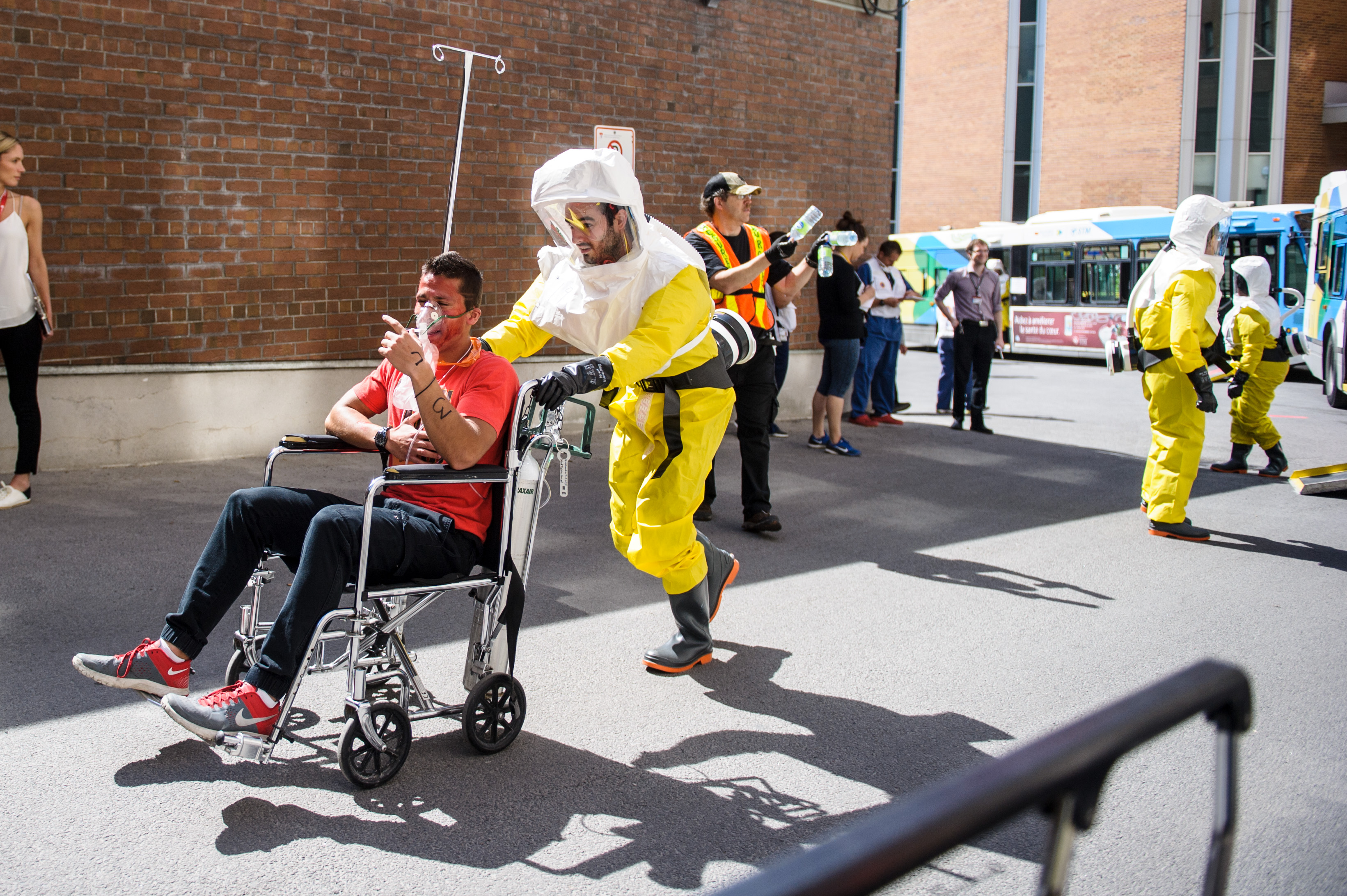 Le Centre universitaire de santé McGill (CUSM) a simulé jeudi une intervention d’urgence auprès d’une cinquantaine de patients-acteurs blessés ou traumatisés par le déraillement d’un train, qui contenait des produits chimiques et qui traversait le quartier Saint-Henri.