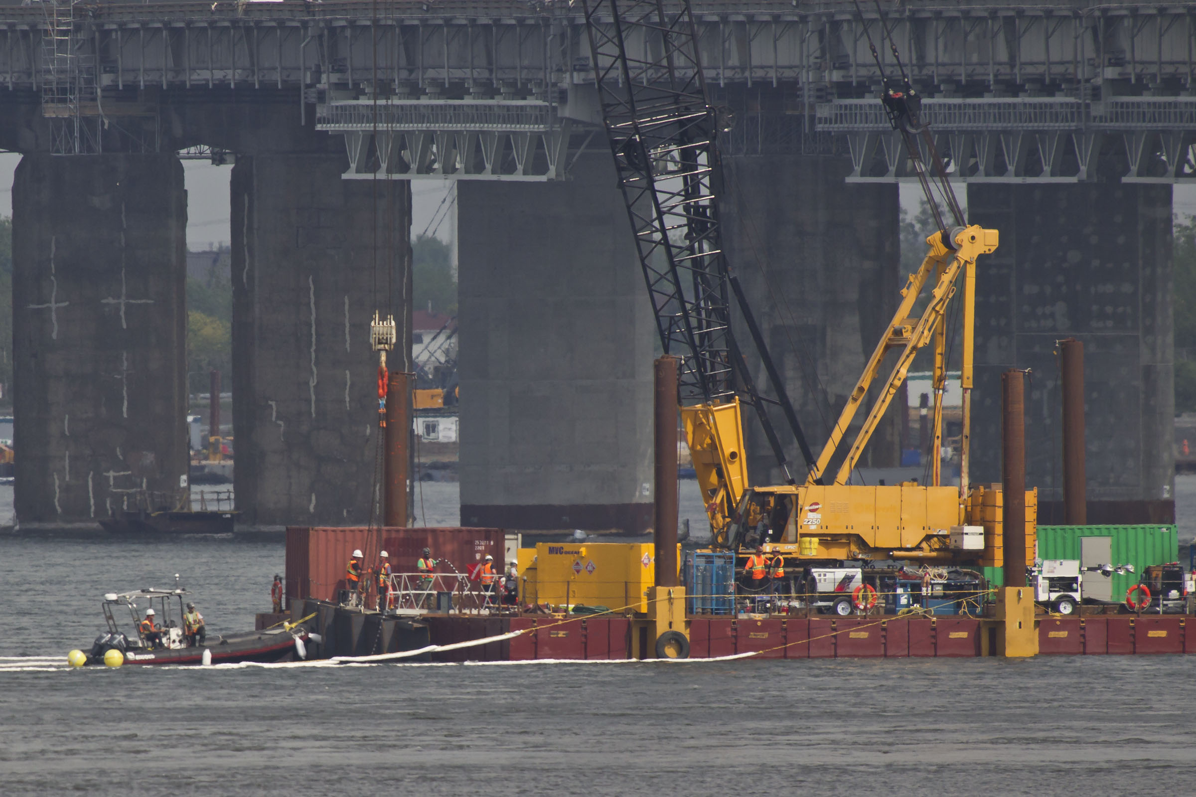 Les ouvriers ont d’abord installé un déflecteur de courant jeudi, à environ 300 m de la jetée ouest, près de L’Île-des-Sœurs, où a eu lieu l’accident qui n’a fait aucun blessé. Le renflouement a pris trois jours et s’est déroulé parallèlement aux travaux de construction du nouveau pont Champlain.