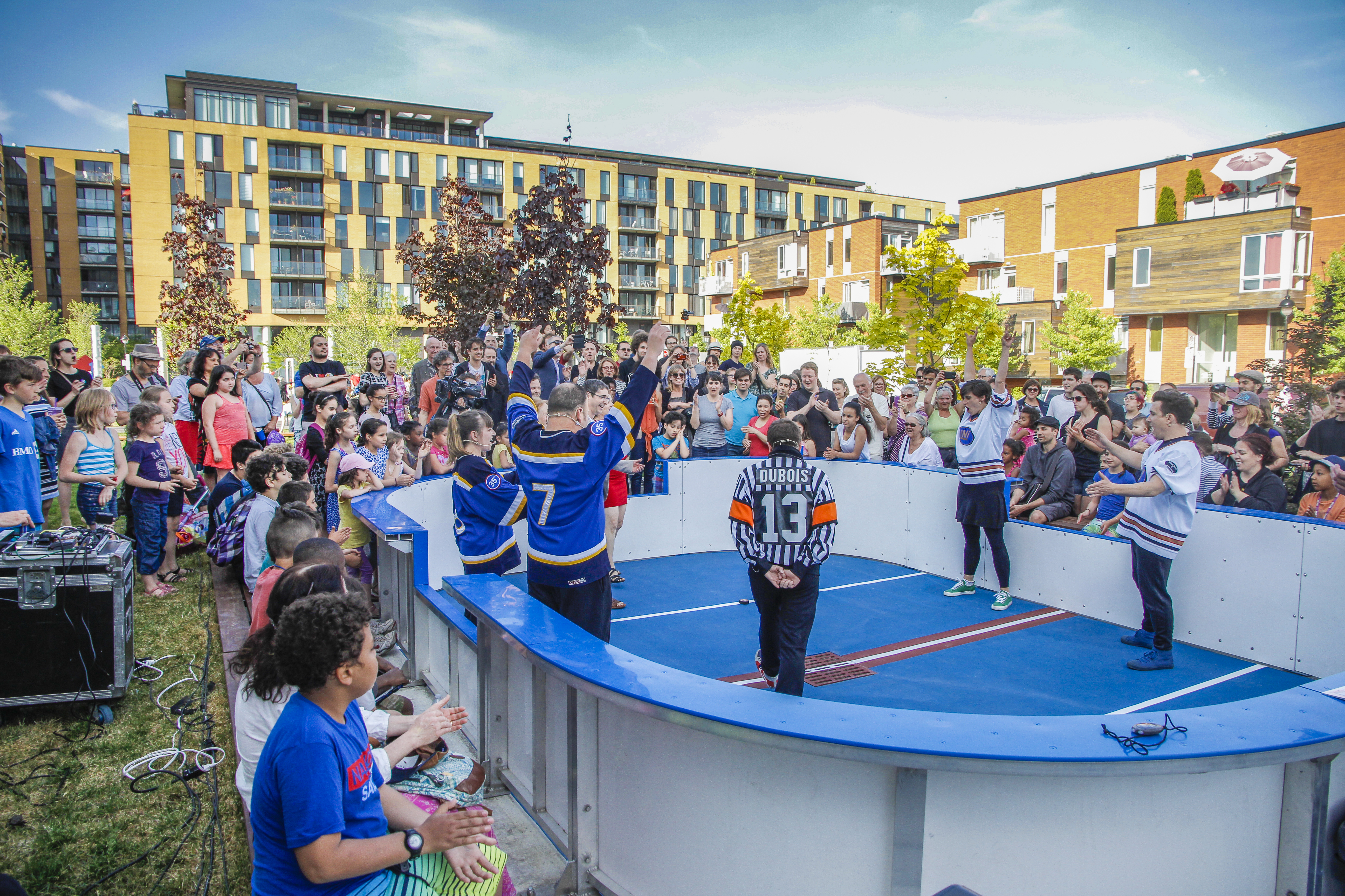 Parmi les invités à l’inauguration, la famille du comédien était présente autour du maire de Rosemont-La Petite-Patrie François Croteau mais aussi de François-Étienne Paré, directeur artistique de la Ligue nationale d’improvisation (LNI), venu donner le coup d’envoi de la patinoire extérieure d’improvisation.