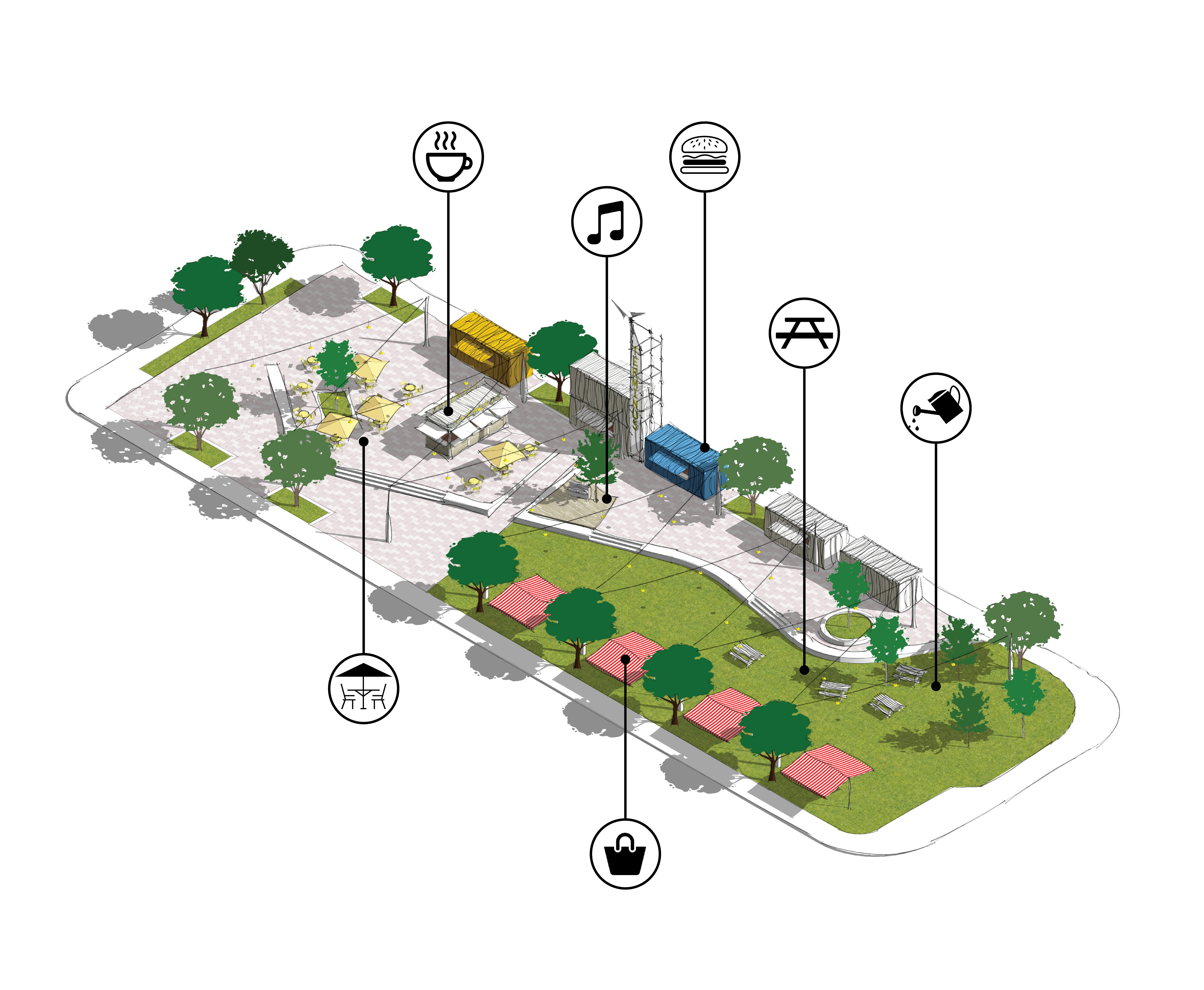 L’entreprise Beam Me Up a permis de visualiser l’ambiance qui va y régner. Un petit café avec une terrasse donne envie de s’arrêter siroter un espresso. L’éclairage suspendu recrée l’atmosphère d’un film romantique. On entend presque déjà la musique venant du piano public installé sur la petite scène.