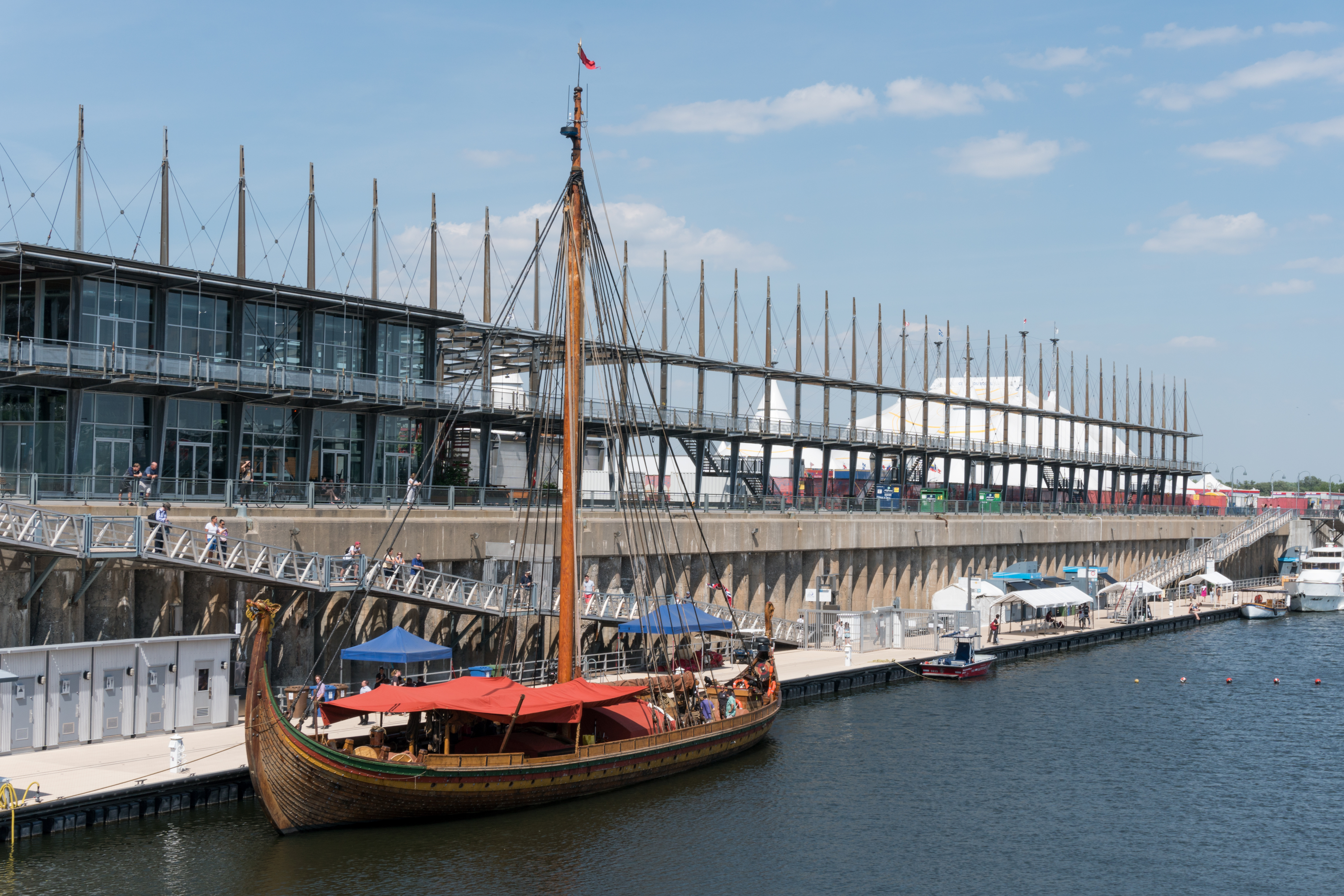 Le Draken Harald Hårfagre, une réplique de vaisseau viking qui a traversé l’Atlantique depuis la Norvège, est amarré au quai Bassin Jacques Cartier, dans le Vieux-Port de Montréal, jusqu’à mercredi. Le navire sera d’ailleurs ouvert au public mardi de 14h à 18h.