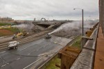 Deux travées totalisant une soixantaine de mètres de l’ouvrage construit en 1966 ont été réduites en poussière. Les ouvriers ont mis au sol les sections situées au-dessus des voies faisant le lien entre les autoroutes 15, 20 et 720.