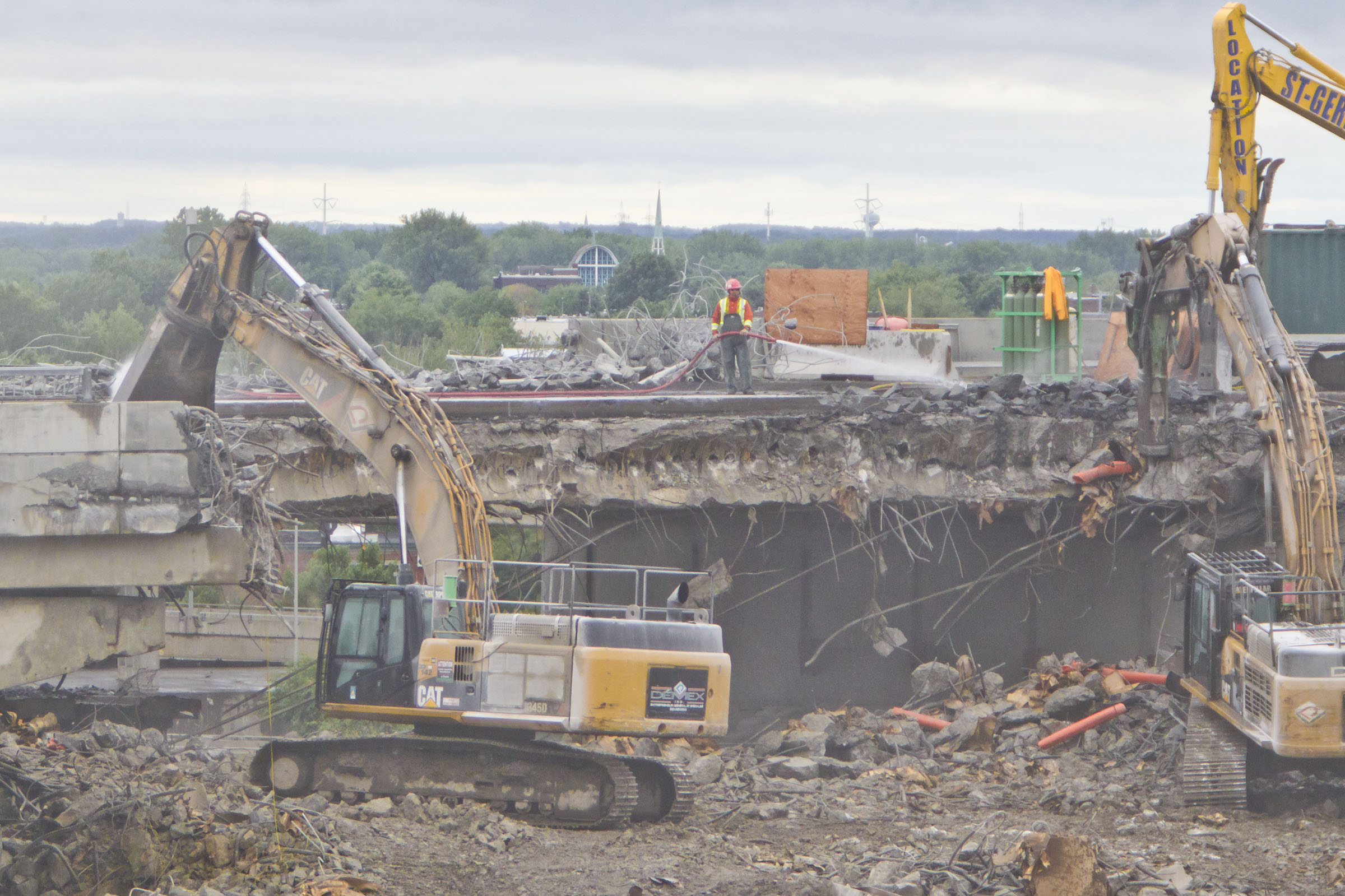 Deux travées totalisant une soixantaine de mètres de l’ouvrage construit en 1966 ont été réduites en poussière. Les ouvriers ont mis au sol les sections situées au-dessus des voies faisant le lien entre les autoroutes 15, 20 et 720.
