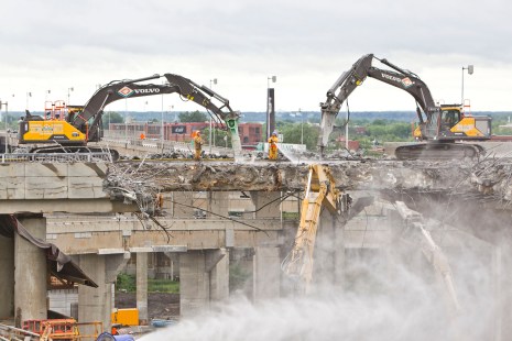 Deux travées totalisant une soixantaine de mètres de l’ouvrage construit en 1966 ont été réduites en poussière. Les ouvriers ont mis au sol les sections situées au-dessus des voies faisant le lien entre les autoroutes 15, 20 et 720.