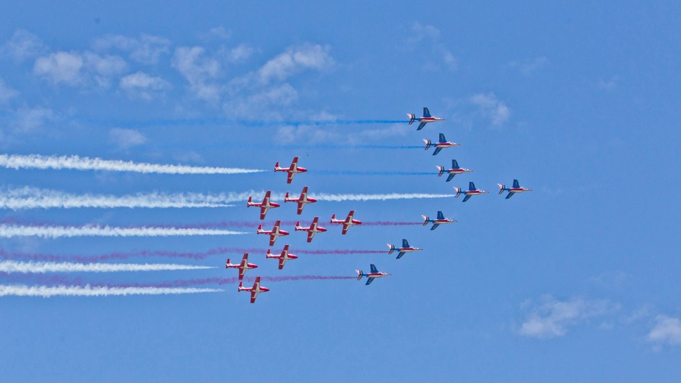Une dizaine de jets de l’armée de l’air française, accompagnée d’appareils des Snowbirds des Forces armées canadiennes, ont survolé le centre-ville de Montréal mardi midi, formant un nuage aux couleurs