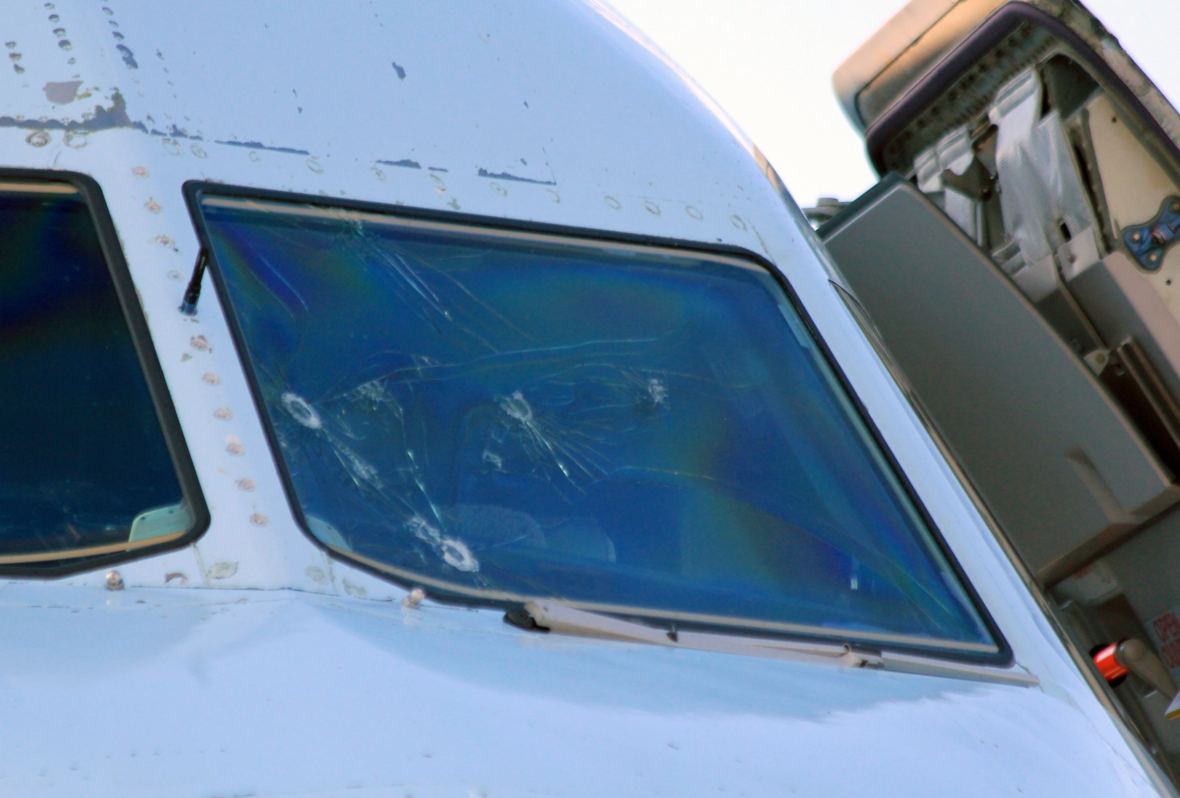 Des photos publiées sur Twitter ont clairement montré plusieurs fissures dans le pare-brise du côté gauche de l’appareil.