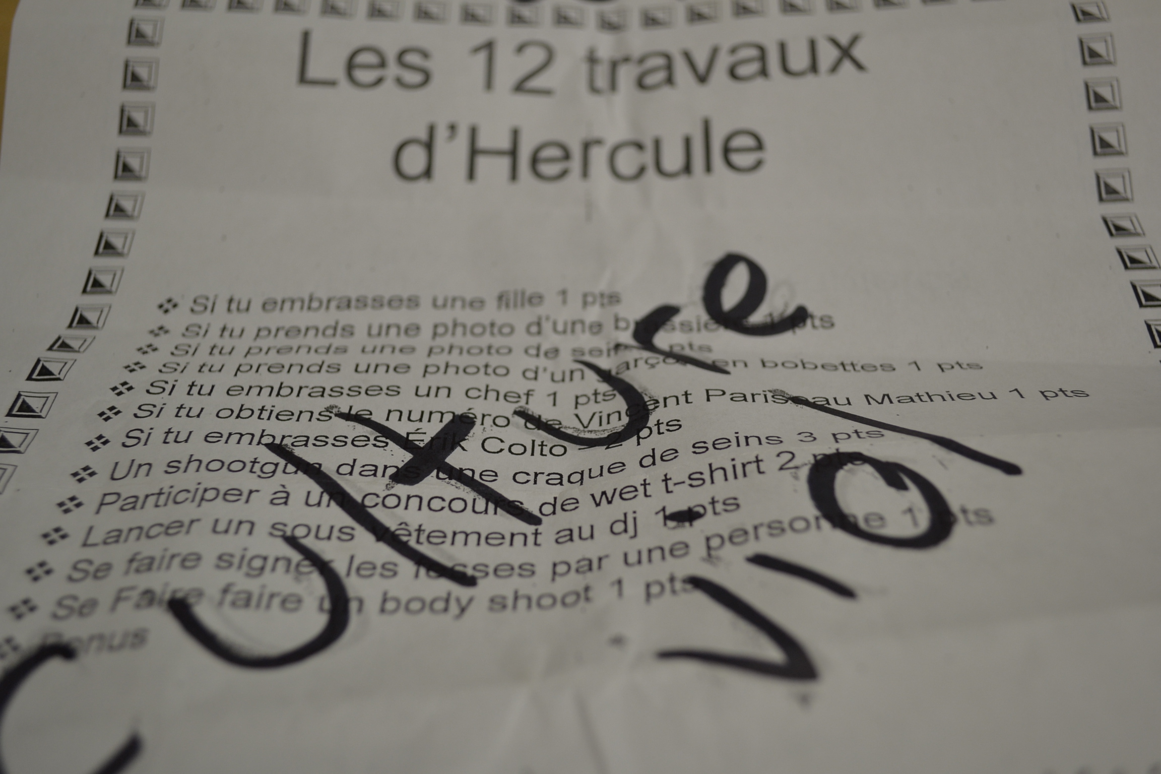 Les 12 travaux d’Hercule, une liste de défis à caractère sexuel, s’est retrouvée à être distribuée dans tout le campus de l’UQO. Embrasser une fille pour 1 point, participer à un concours de wet t-shirt pour 2 points ou prendre un shooter dans une craque de seins pour 3 points étaient quelques-uns des défis à accomplir pour gagner les faveurs des chefs des Jeux. La récompense? L’espoir d’être choisi dans la délégation 2017 de l’UQO aux JDLC.
