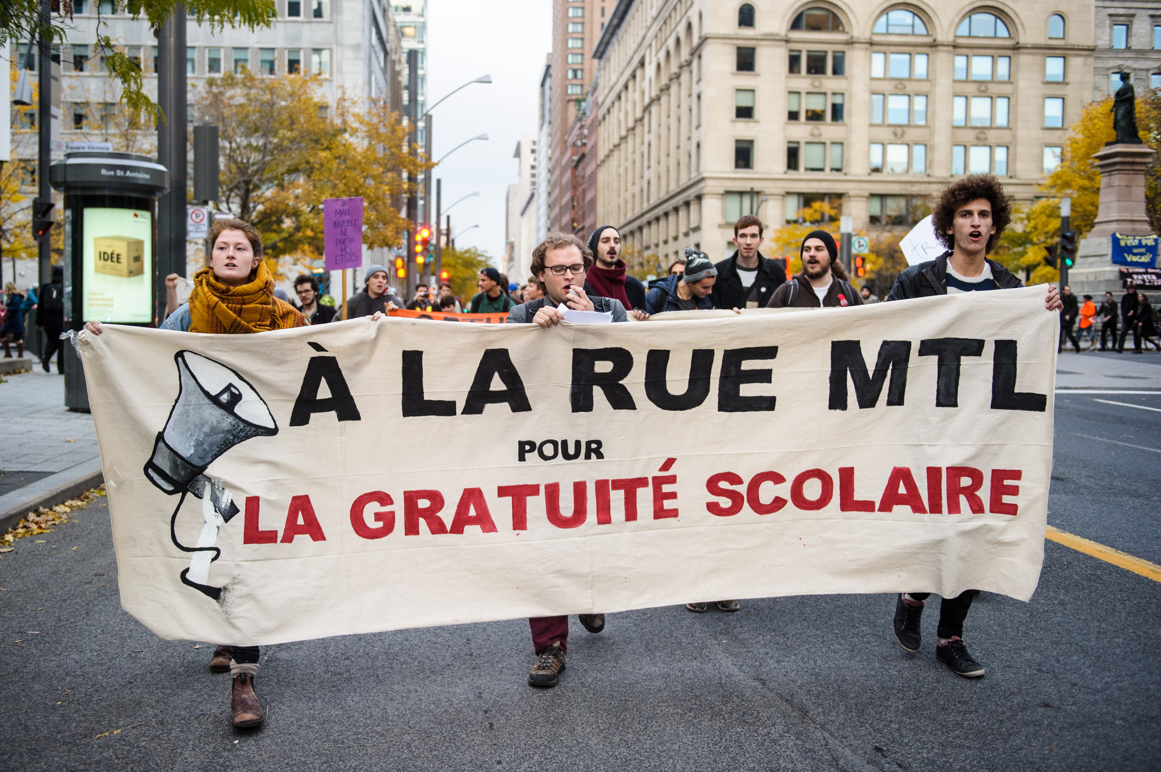 À Montréal, quelques dizaines de personnes se sont rassemblées pour une marche au centre-ville en fin d’après-midi, à l’appel du Comité unitaire sur le travail étudiant (CUTE) de l’UQAM et du collectif À la Rue Montréal. Ils réclament non seulement la gratuité scolaire, mais aussi une rémunération pour les stagiaires, ainsi qu’un salaire pour les étudiants.