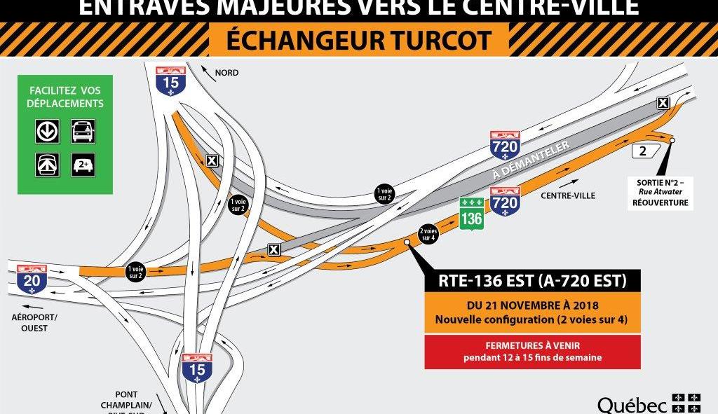 Les quatre voies de l’autoroute 720 en direction est seront définitivement fermées à la circulation et la circulation sera déviée sur les deux premières voies de la nouvelle route 136 en direction est (A-720), entre l’échangeur Turcot et la sortie n° 3.