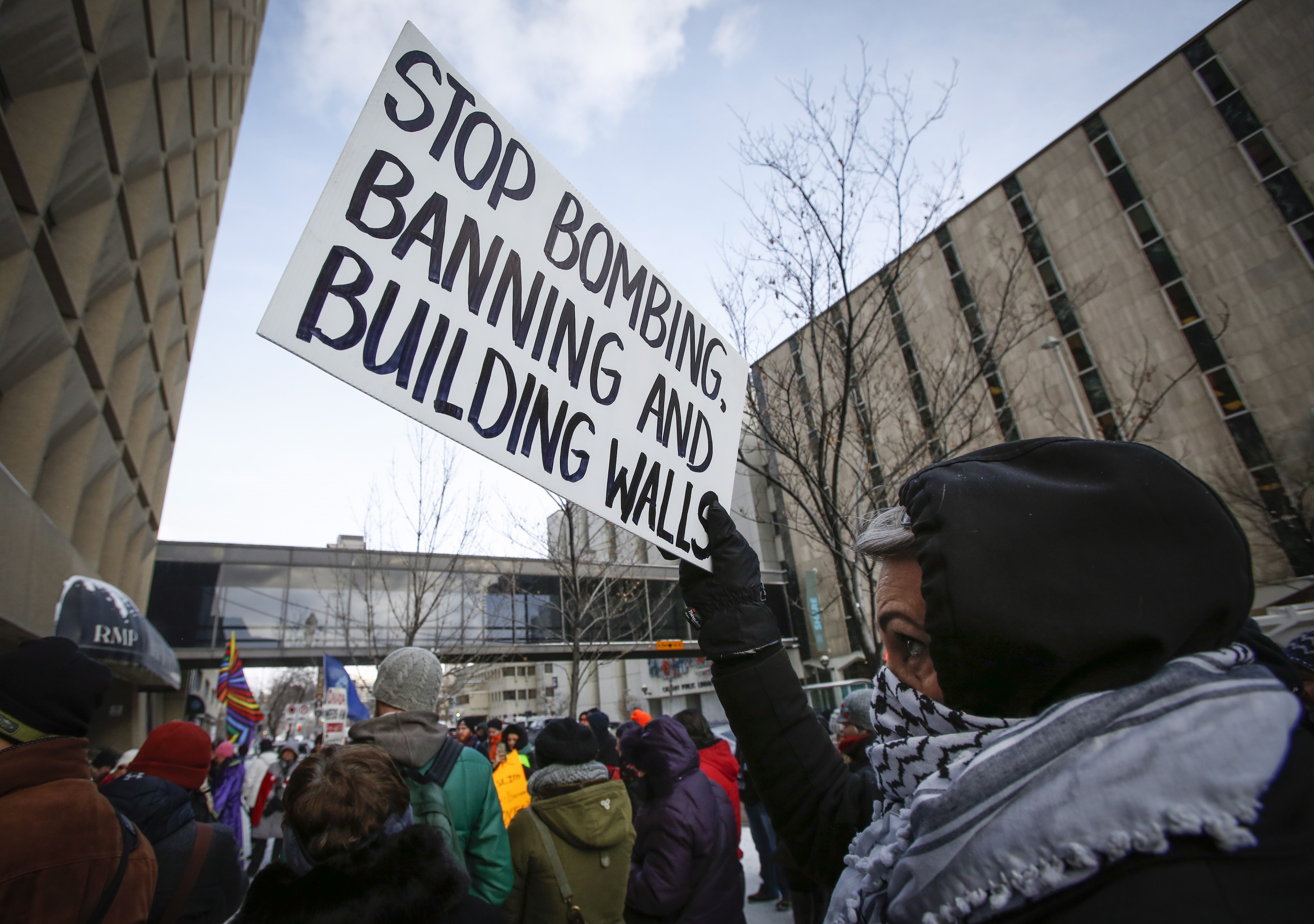 À Toronto, des centaines de personnes se sont réunies devant le consulat américain, au lendemain de la décision d’un juge fédéral américain de lever temporairement, à la grandeur du pays, la mesure promulguée par M. Trump.
