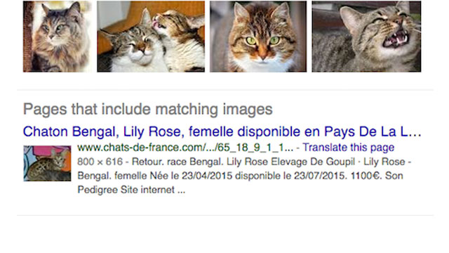 – Les photos qui accompagnent l’annonce se retrouvent sur d’autres sites web, ce qui confirme que ce ne sont pas des images du chat qu’on prétend vouloir donner. Il est possible de vérifier en faisant une recherche d’image inversée sur Google.