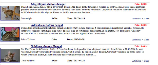 Sur le site Fouinez.com, les annonces relatives à des chatons de Bengal (à noter que d’autres races de chats et de chiens font l’objet de ces stratagèmes) à donner pullulent.