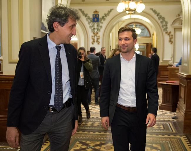 À ses côtés, le député Amir Khadir a alors volé au secours de celui qui pourrait succéder à Françoise David dans l’élection complémentaire à venir dans Gouin. Le député de Mercier a tenté de répondre à sa place, quand les journalistes sont revenus à la charge sur les préférences scolaires de M. Nadeau-Dubois à l’adolescence.