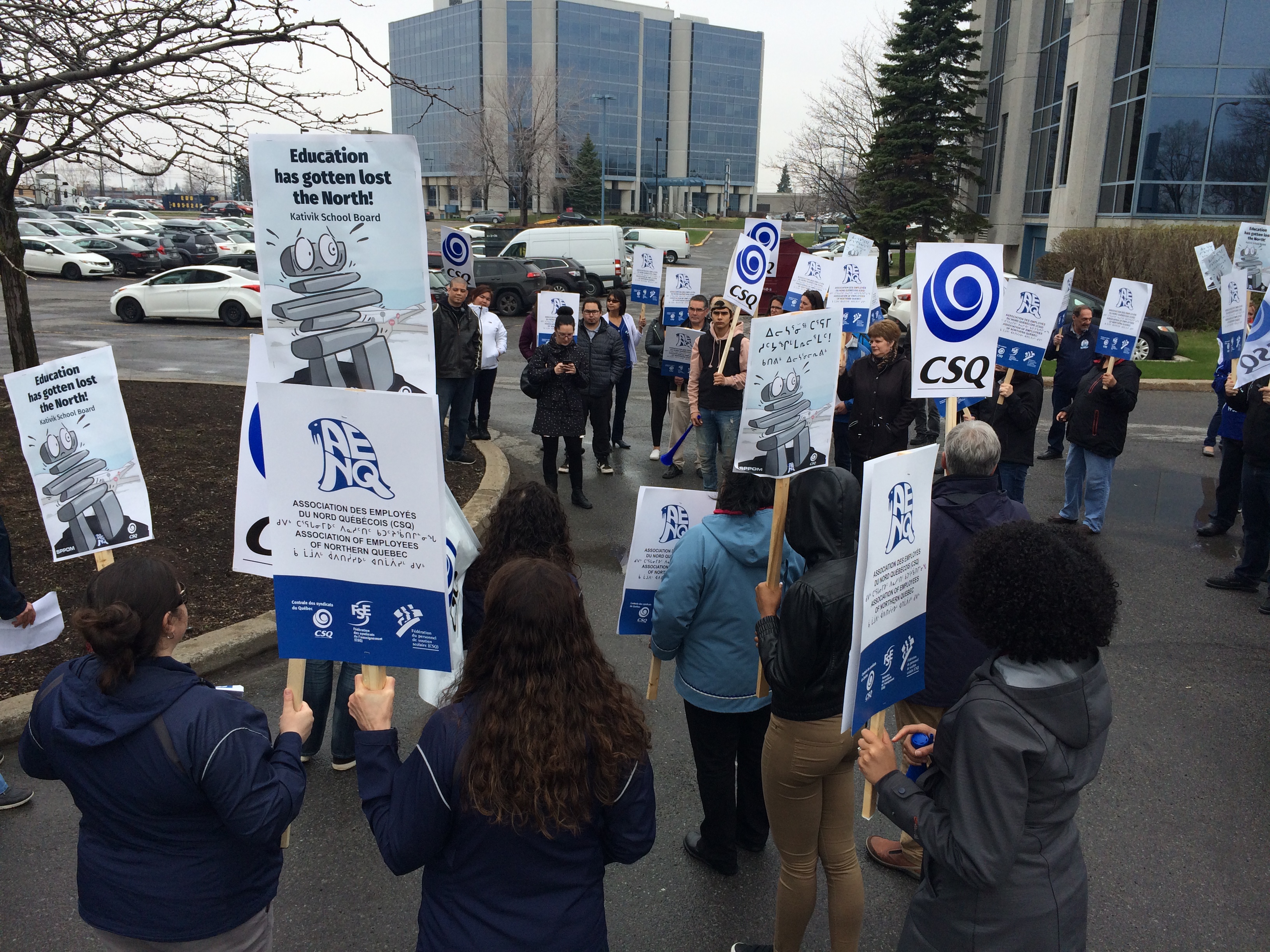 Sans contrat de travail depuis deux ans et demi, des enseignants et membres du personnel de la Commission scolaire Kativik, qui couvre une partie du Nord-du-Québec, ont manifesté devant son siège social, à Saint-Laurent, mercredi. Ils cherchent à faire débloquer la négociation.
