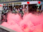 Les militants ont lancé des bombes fumigènes à la police, qui a répondu avec du gaz lacrymogène. Quelques vitrines de banques aussi été fracassées. Seule une personne a été arrêtée pour voie de faits contre un policier.