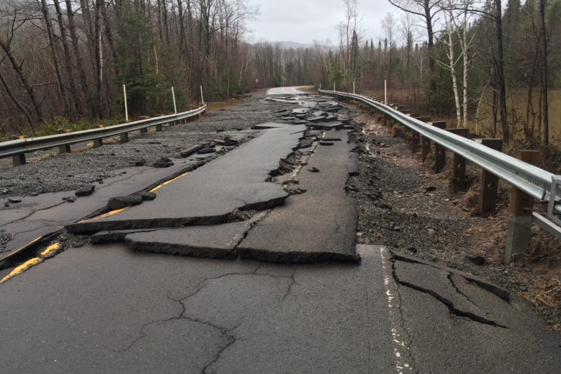 Pour ce qui est de la portion sud, on parle d’éboulis et de détachement de chaussée. Bien que les images soient impressionnantes, le porte-parole est d’avis que des travaux de réparation pourraient permettre une réouverture prochaine si le niveau des rivières demeure stable.