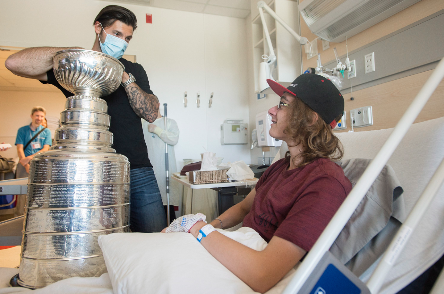 Kristopher Letang marche dans le CHU Sainte-Justine avec la coupe sur un chariot, principalement dans les unités de soins pédiatriques, s’arrêtant pour une prise de photo rapide ou entrant pour discuter avec les jeunes patients.