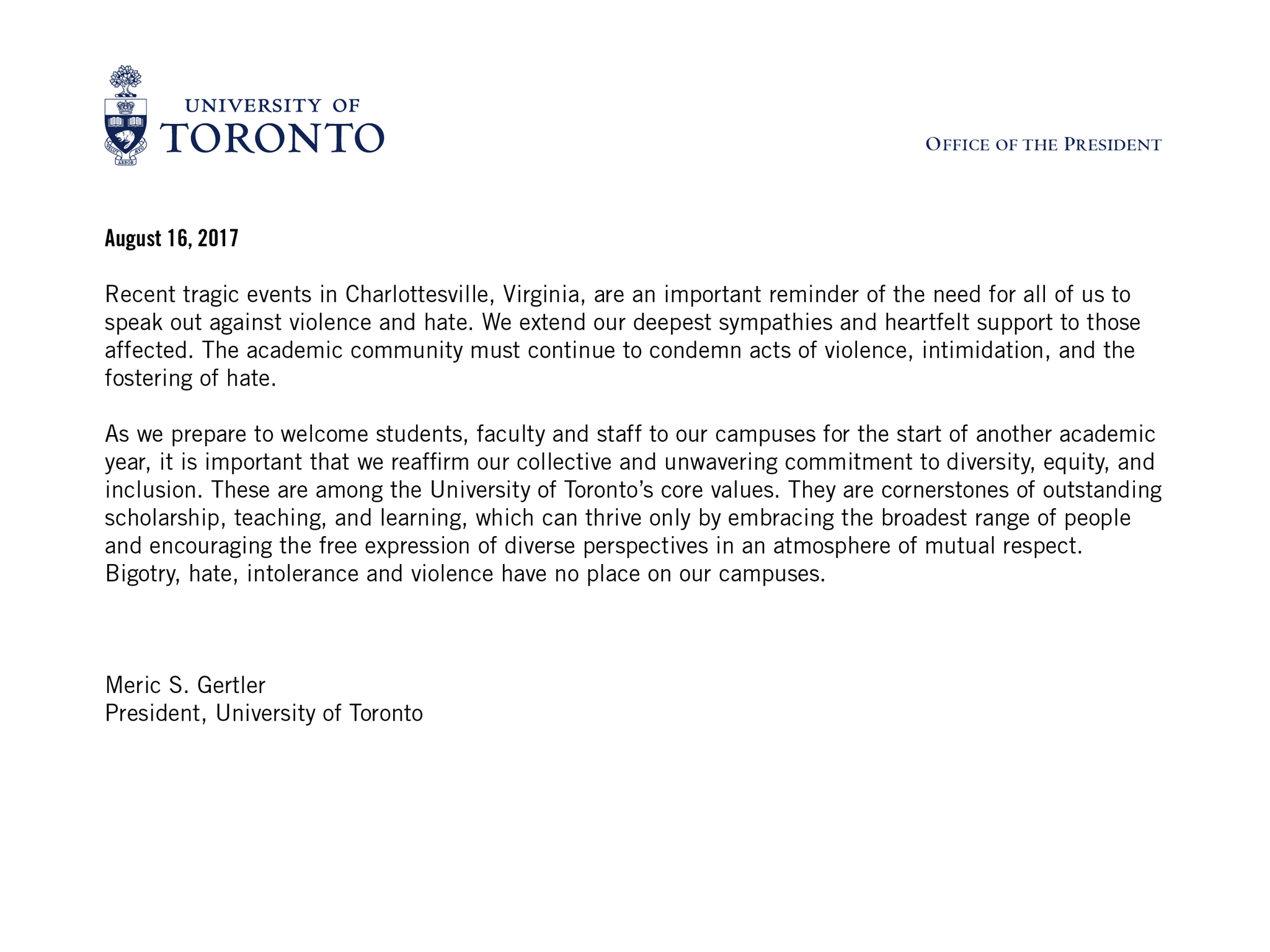 Dans un communiqué qui ne fait pas allusion directement au groupe «nationaliste canadien», le président de l’université, Meric Gertler, indique que l’intolérance, la haine et la violence n’ont pas leur place sur le campus. Alors que l’institution s’apprête à accueillir les étudiants et le personnel pour la nouvelle année scolaire, il a estimé qu’il était important de «réaffirmer l’engagement collectif et indéfectible de la communauté universitaire envers la diversité, l’équité et l’inclusion». M. Gertler soutient que ces valeurs d’ouverture constituent la pierre angulaire de l’enseignement et de la vie universitaires.