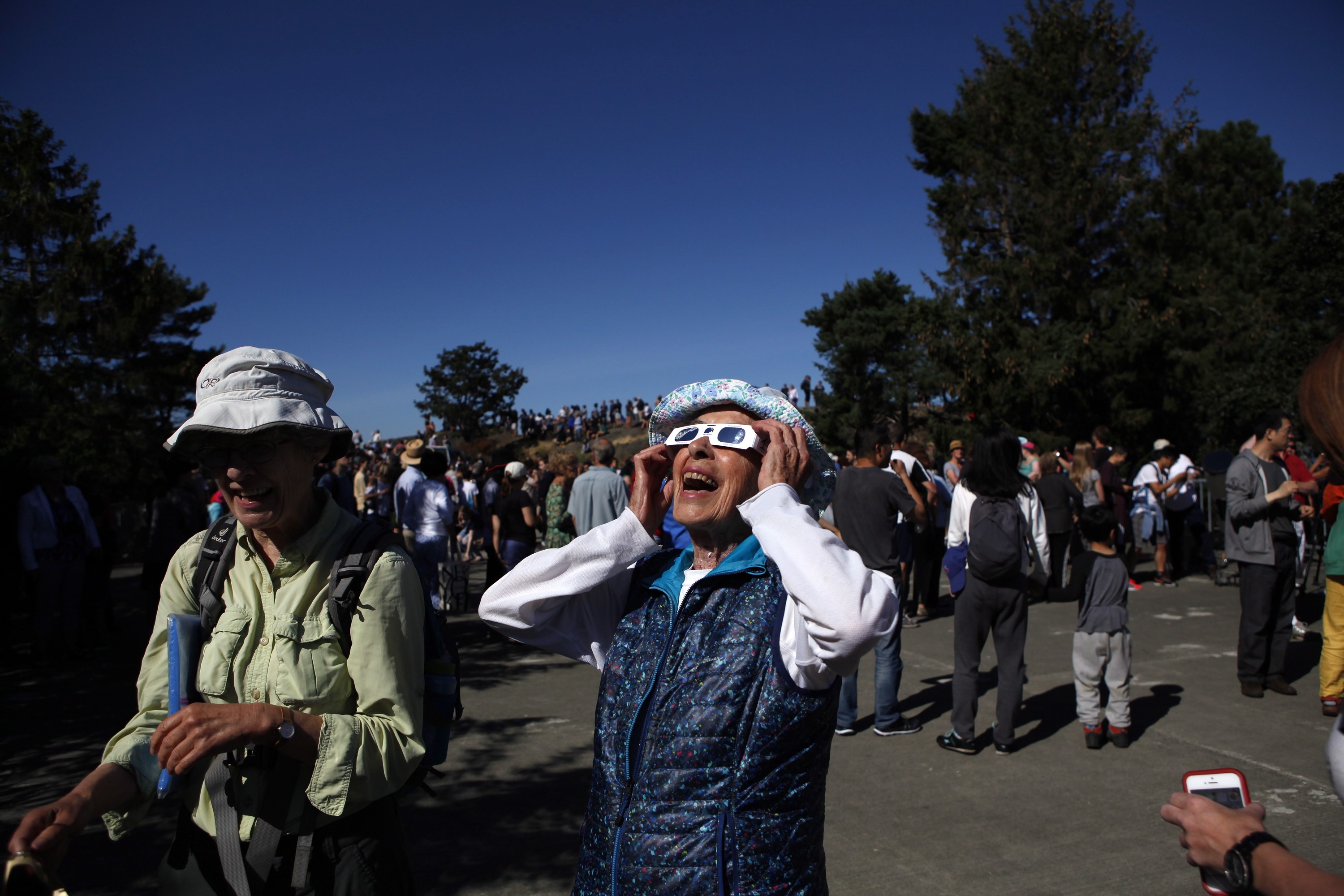 Hundreds of people gathered at Mount Tolmie to take in the partial solar eclipse in Victoria, B.C., on Monday, August 21, 2017. THE CANADIAN PRESS/Chad Hipolito