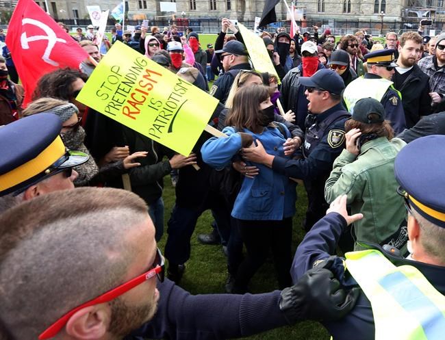 Des policiers vêtus de tenue antiémeute ont été déployés en grand nombre tant à Saint-Bernard-de-Lacolle qu’à Ottawa afin de séparer les deux groupes.