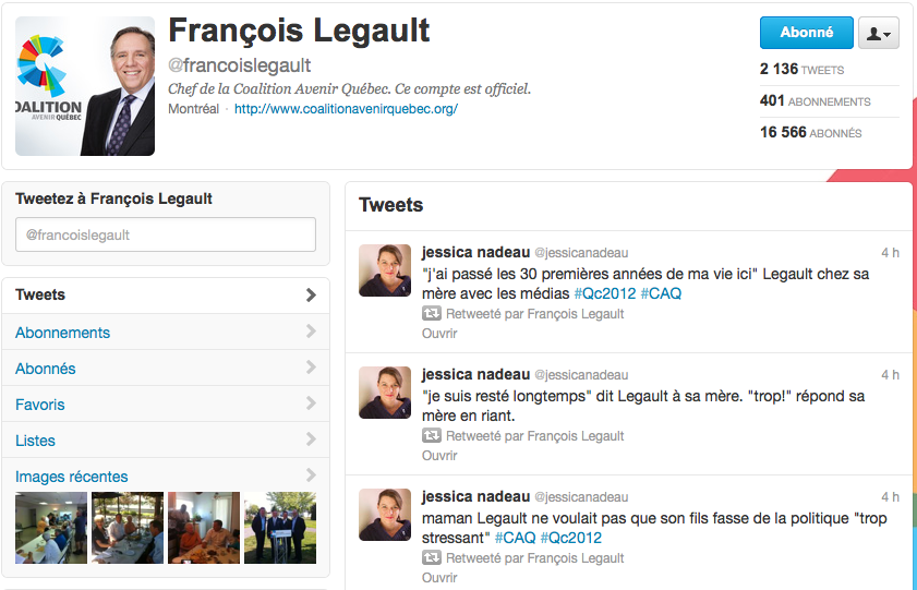 Sur Twitter, le politicien de l’heure est probablement François Legault. Le chef de la Coalition Avenir Québec (CAQ) compte 16 500 abonnés et publie plusieurs dizaines de messages par jour. Annonces du parti et critiques des adversaires sont diffusées sur son compte.