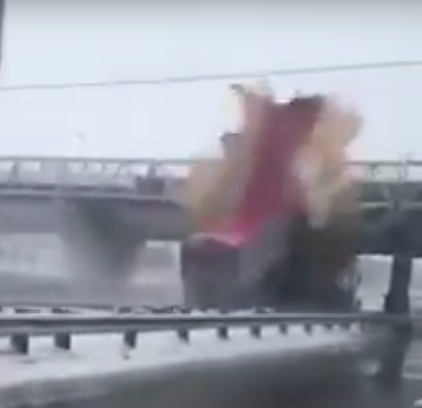 La benne a complètement explosé sous le violent impact. Heureusement, personne n’a été blessé. Des morceaux de la benne se sont encastrés dans la passerelle.