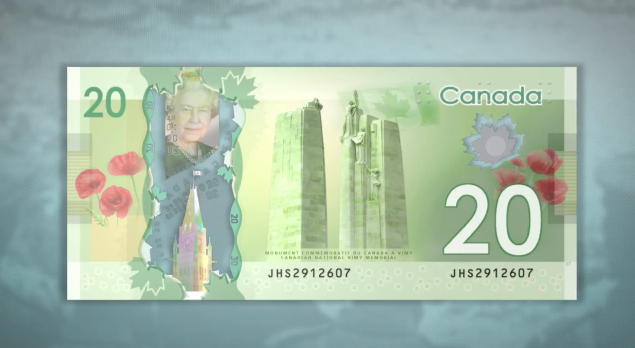 Le nouveau billet en polymère rend hommage à la contribution et aux sacrifices faits par des Canadiens durant les conflits militaires et son verso est orné du Monument commémoratif du Canada, à Vimy, en France.