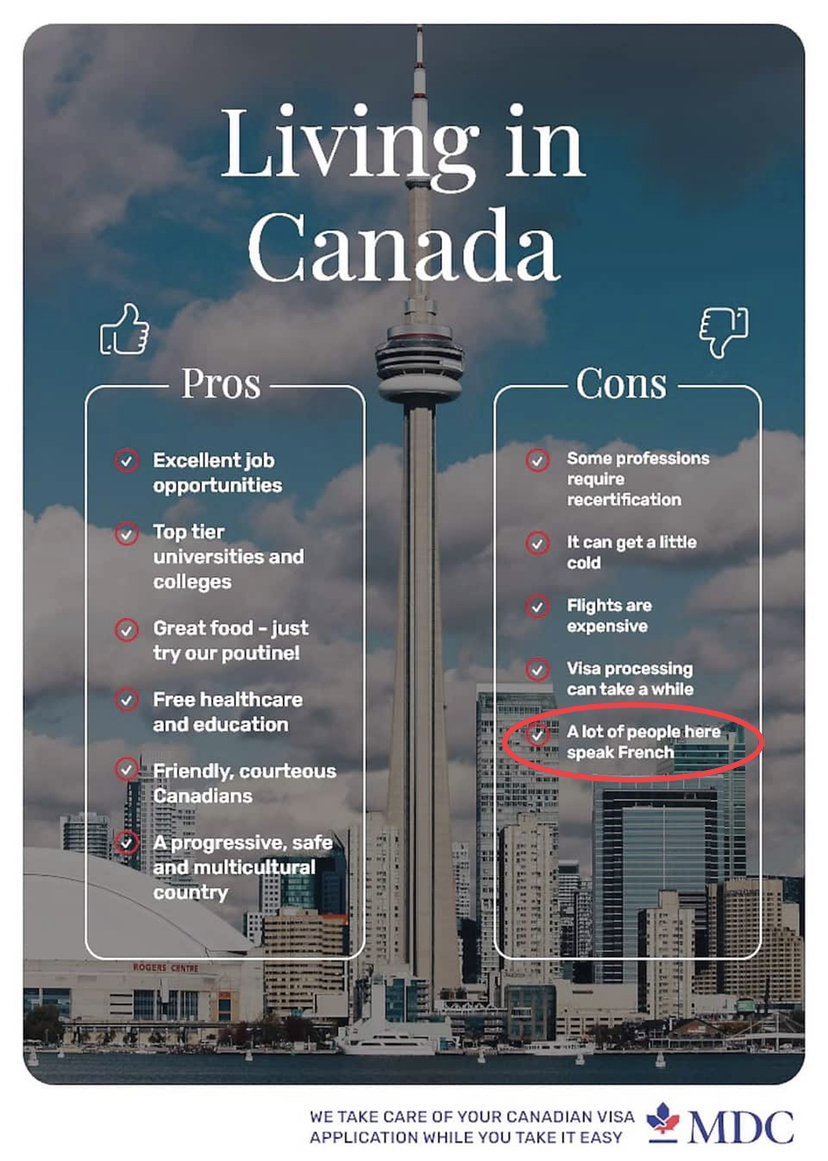La firme de consultants en immigration MDC Canada crée un tollé sur les réseaux sociaux à cause d’une publication qui sous-entend que le français est un point négatif à l’immigration au Canada.