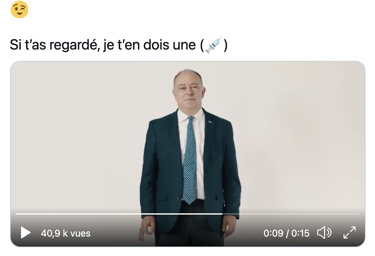 Vendredi, plusieurs politiciens québécois ont diffusé sur les réseaux sociaux des vidéos d’eux faisant un subtil signe de rond avec les doigts près de leur cuisse. La vidéo conclut en faisant valoir que la vaccination contre la COVID-19 ne ferait «pas plus mal qu’une bine».