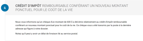 Si vous souhaitez vérifier le montant qui vous est alloué, allez consulter le site officiel de Revenu Québec en vous connectant à l’espace «Mon dossier». Vous trouverez ensuite l’information sous l’onglet «Crédit d’impôt remboursable conférant un nouveau montant ponctuel pour le coût de la vie». Il est possible que la date à laquelle vous recevrez la somme ne soit pas divulguée. Dans ce cas, il faut essayer de nouveau dans quelques jours.
