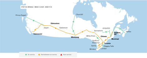 En raison des intempéries et du vent violent, le début du trajet a été ralenti: 2h30 pour rejoindre Cornwall depuis Montréal, au lieu d’1h15 habituellement. Dans le même temps, le phénomène météorologique a provoqué d’impressionnantes coupures de courant, notamment autour de Kingston en Ontario.