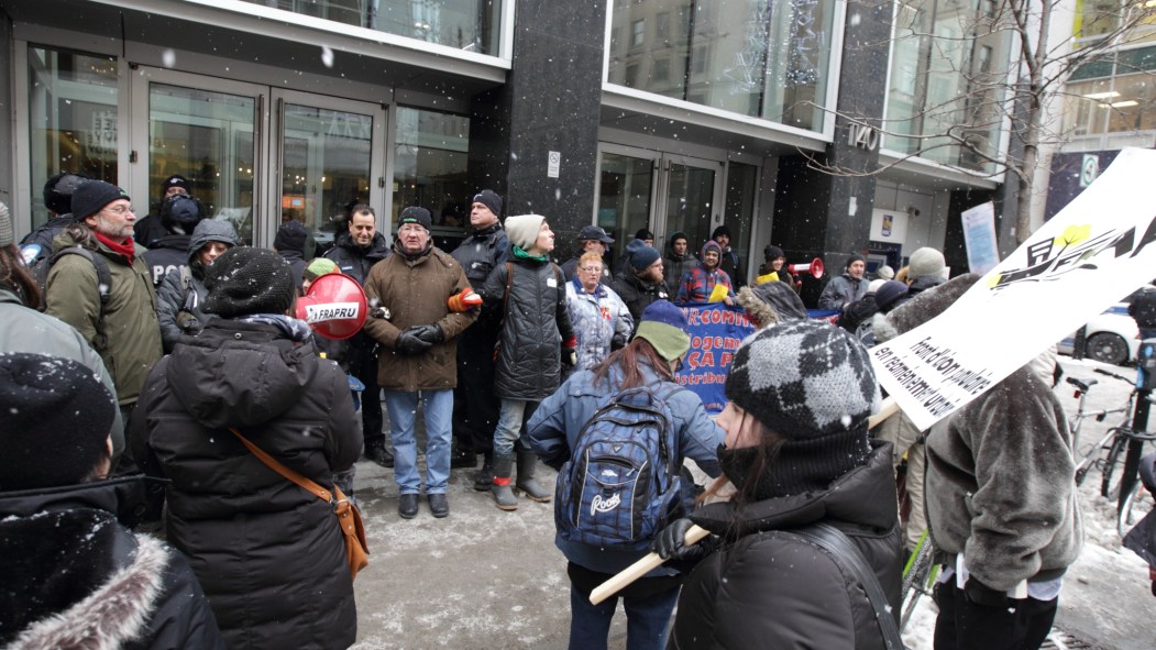 Des membres du Front d’action populaire en réaménagement urbain (FRAPRU) ont temporairement bloqué mercredi l’accès à une succursale de la Banque Royale du Canada, au centre-ville, pour faire passer leur message.