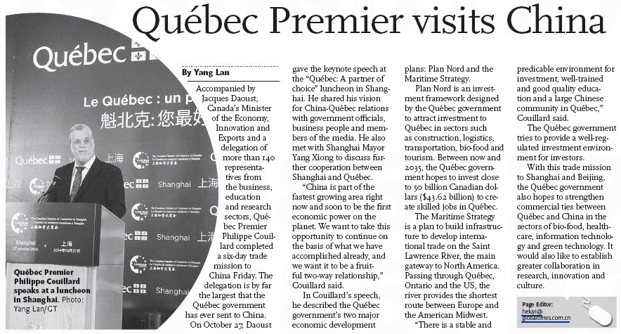 Fait rare, près d’une quinzaine d’éléments de nouvelles ont été produits en Chine sur la visite du premier ministre Couillard la semaine dernière. La délégation québécoise menée par M. Couillard y était pour discuter d’économie.