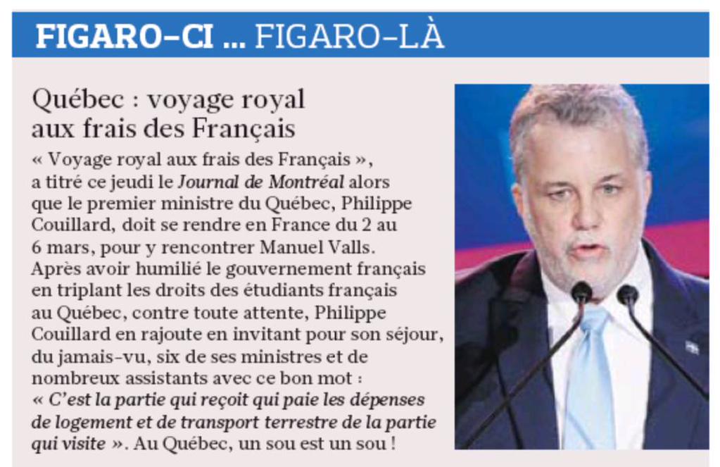 M. Couillard a constaté que dans sa livraison de vendredi, le journal parisien Le Figaro a repris une manchette publiée au Québec cette semaine, «Voyage royal aux frais des Français».