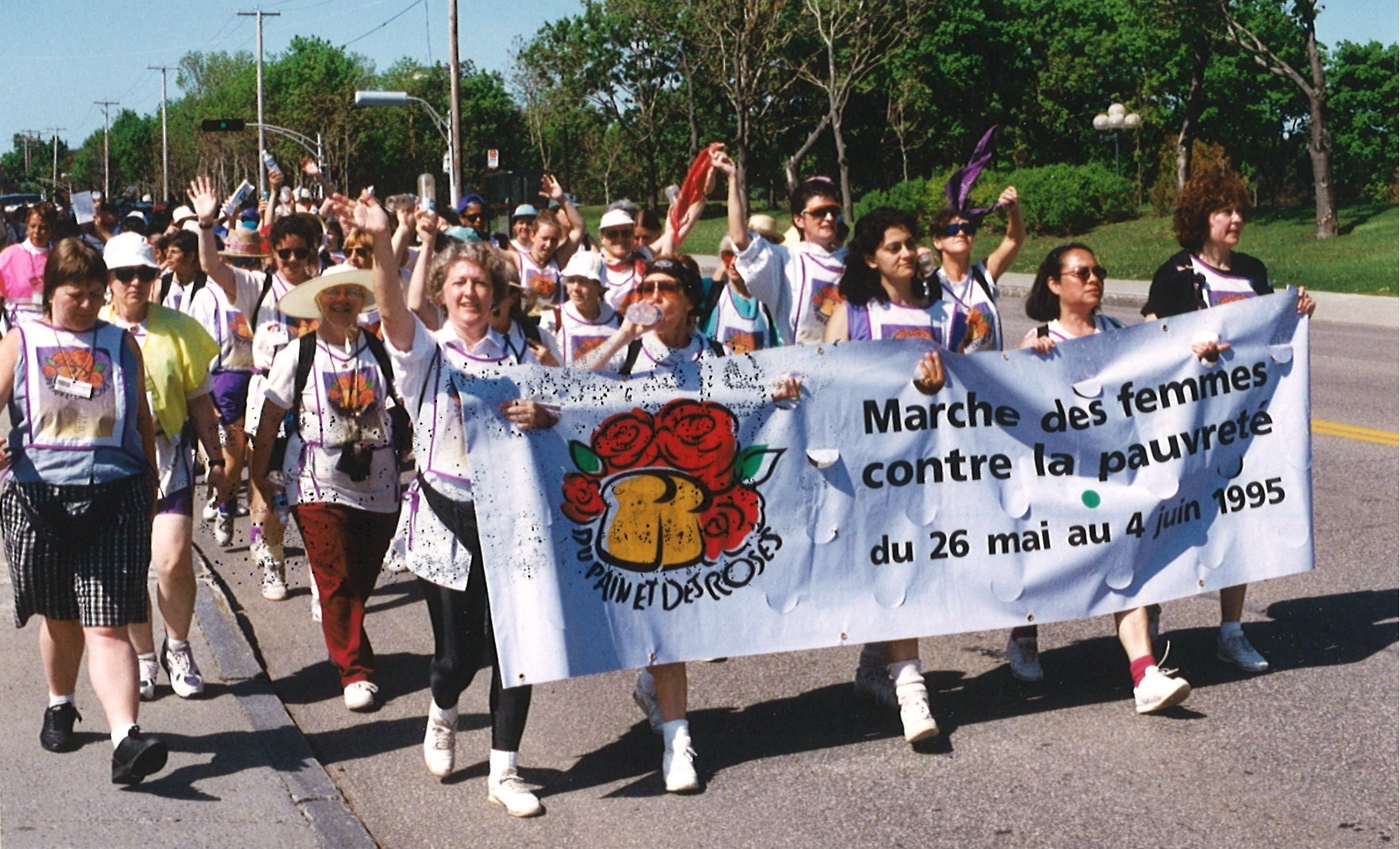 Le 26 mai 1995, la Marche du pain et des roses a été lancée. Sac sur le dos et espadrilles dans les pieds, les femmes ont délaissé leur famille et se sont mis en marche vers la Capitale pour aller porter leurs revendications pour freiner la pauvreté. En chemin, elles échangeaient sur leur vécu, sinon elles chantaient, notamment l’hymne à la marche qui a été popularisée par Marie-Claire Séguin. Dans les villages, des citoyens les encourageaient et les cloches des églises résonnaient.