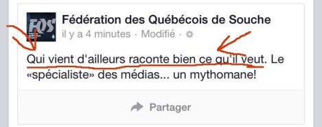Connaissant les penchants racistes de la FQS, j’ai vite rejeté cette hypothèse. Ce groupe distribue des tracts anti-immigration, colle des collants «O% Halal, 0% Casher, 100% Québécois» et ne souligne sur sa page Facebook que les scandales concernant les individus qui ne sont pas blancs et nés au Québec (ou qui sont homosexuels). D’ailleurs, dans les minutes qui ont suivi, la FQS publiait ce commentaire: