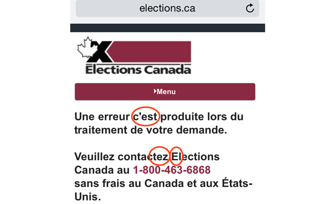 «Une erreur c’est produite lors du traitement de votre demande», peut-on lire sur la page en question. Le verbe être étant dans ce cas-ci pronominal, c’est un «s’» qui aurait dû le devancer, et non un «c’», qui peut être remplacé par «cela est» lorsque correctement utilisé. Dans la deuxième et dernière phrase du message d’erreur, «Veuillez contactez Elections Canada au 1-800-463-6868 sans frais au Canada et aux États-Unis», «contactez» est conjugué à l’impératif plutôt qu’à l’infinitif («contacter»). L’utilisation d’«Elections» sans accent aigu est aussi discutable. Partout ailleurs, sur la version française du site, on privilégie «Élections» avec l’accent.