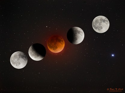 Imaginez être un observateur sur la Lune durant l’éclipse… Le Soleil semble glisser derrière la Terre, qui le masque d’abord partiellement (pénombre), puis totalement. C’est un coucher de Soleil créé par la Terre, mais observé depuis la Lune. Comme lors d’un coucher de Soleil observé sur Terre, l’atmosphère terrestre devient rougeâtre. Un mince anneau de lumière déviée et rougie par son passage dans l’atmosphère de la Terre projette son éclairage sur les observateurs, ainsi que sur la Lune, rendant l’éclipse visible depuis la Terre.