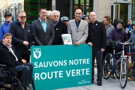 La pétition Sauvons notre Route verte, forte de 48 000 signatures, a été remise à 13 députés de l’Assemblée nationale, dont Philippe Couillard, par Équiterre. Les pétitionnaires souhaitent que le gouvernement revienne sur sa décision d’abolir le budget de 2,8 M$ d’aide à l’entretien du réseau cyclable, la Route verte, remis à différentes municipalités du Québec.