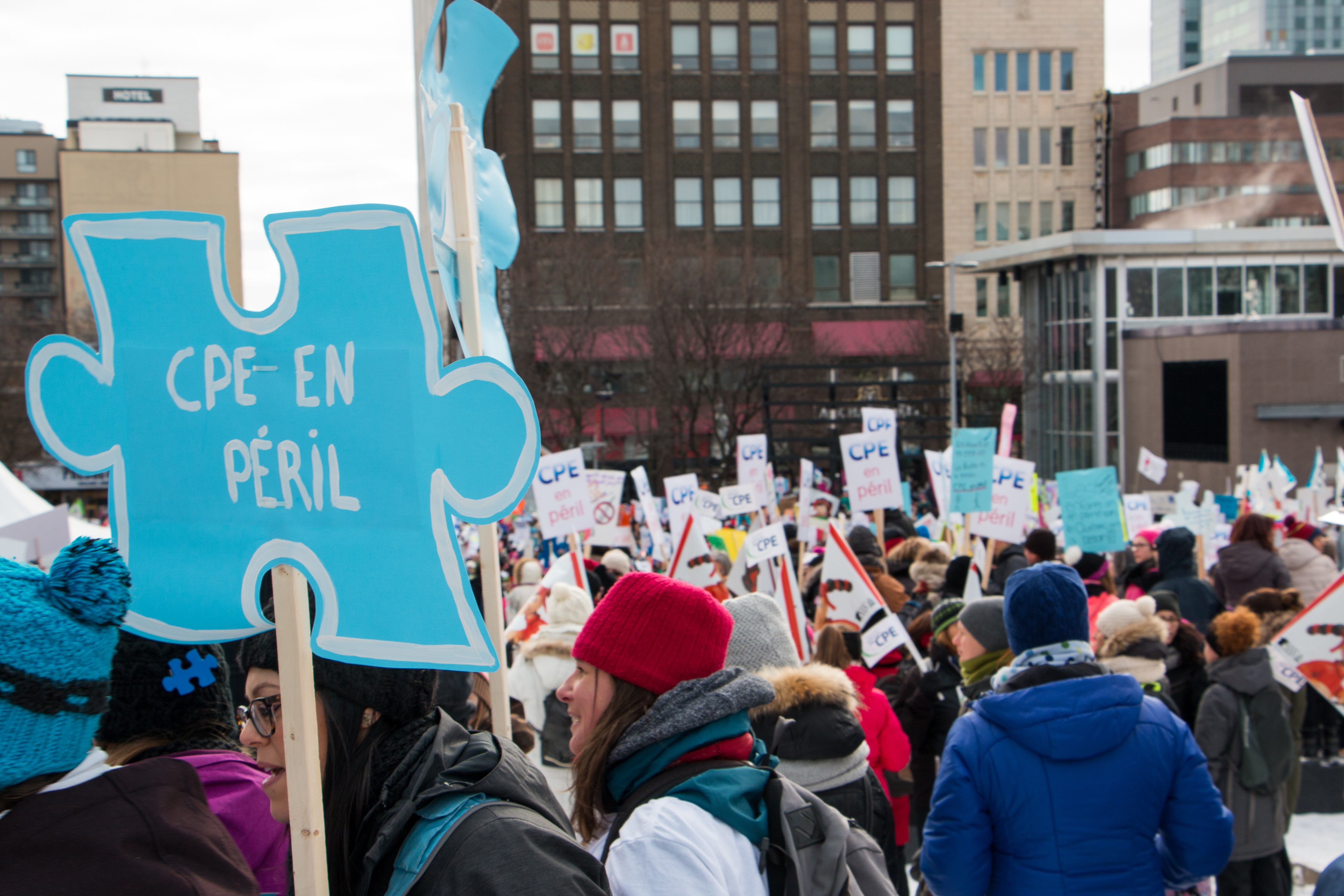 À Montréal, ils étaient 20 000 réunis à la place Émilie-Gamelin, au centre-ville, pour protester contre les coupes de 120 M$ que veut imposer le gouvernement du premier ministre Philippe Couillard, selon L’Association québécoise des centres de la petite enfance (AQCPE).