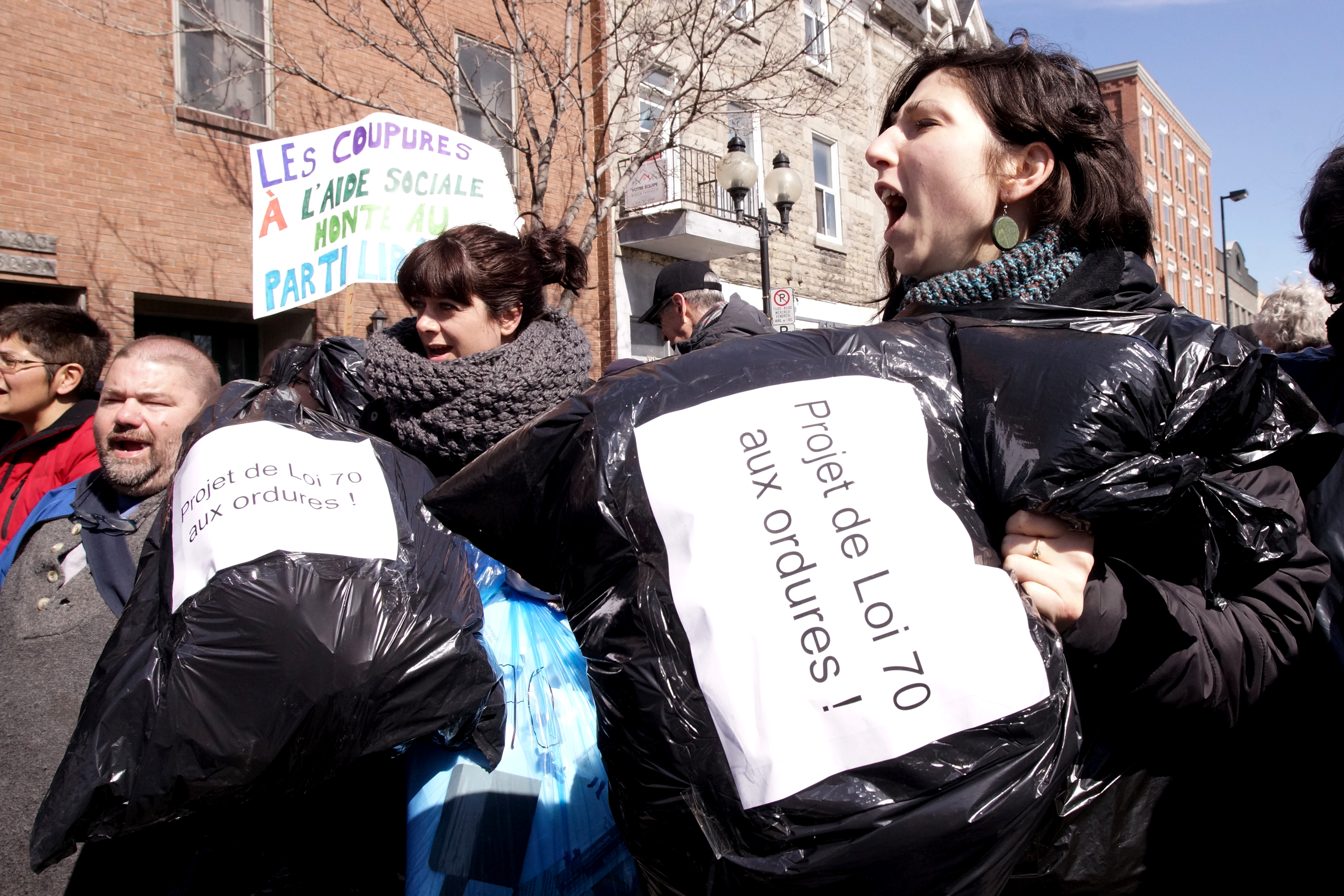Les manifestants sont réunis devant les bureaux de la ministre de l’Économie Dominique Anglade, jugée «complice» de l’adoption prochaine de ces mesures, en particulier les diminutions de prestations imposées aux bénéficiaires de l’aide sociale qui omettront de s’inscrire au programme d’intégration au travail.