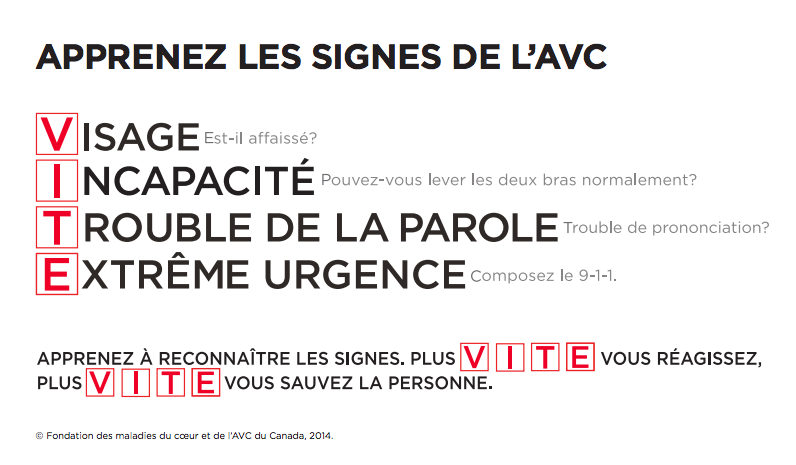 La campagne lancée par la Fondation des maladies du coeur et de l’AVC s’appelle VITE: « V » pour visage, à savoir s’il est affaissé, « I » pour incapacité, comme lever les deux bras normalement, « T » pour trouble de la parole, telle la prononciation, et « E » pour extrême urgence, signifiant l’importance de composez le 911.