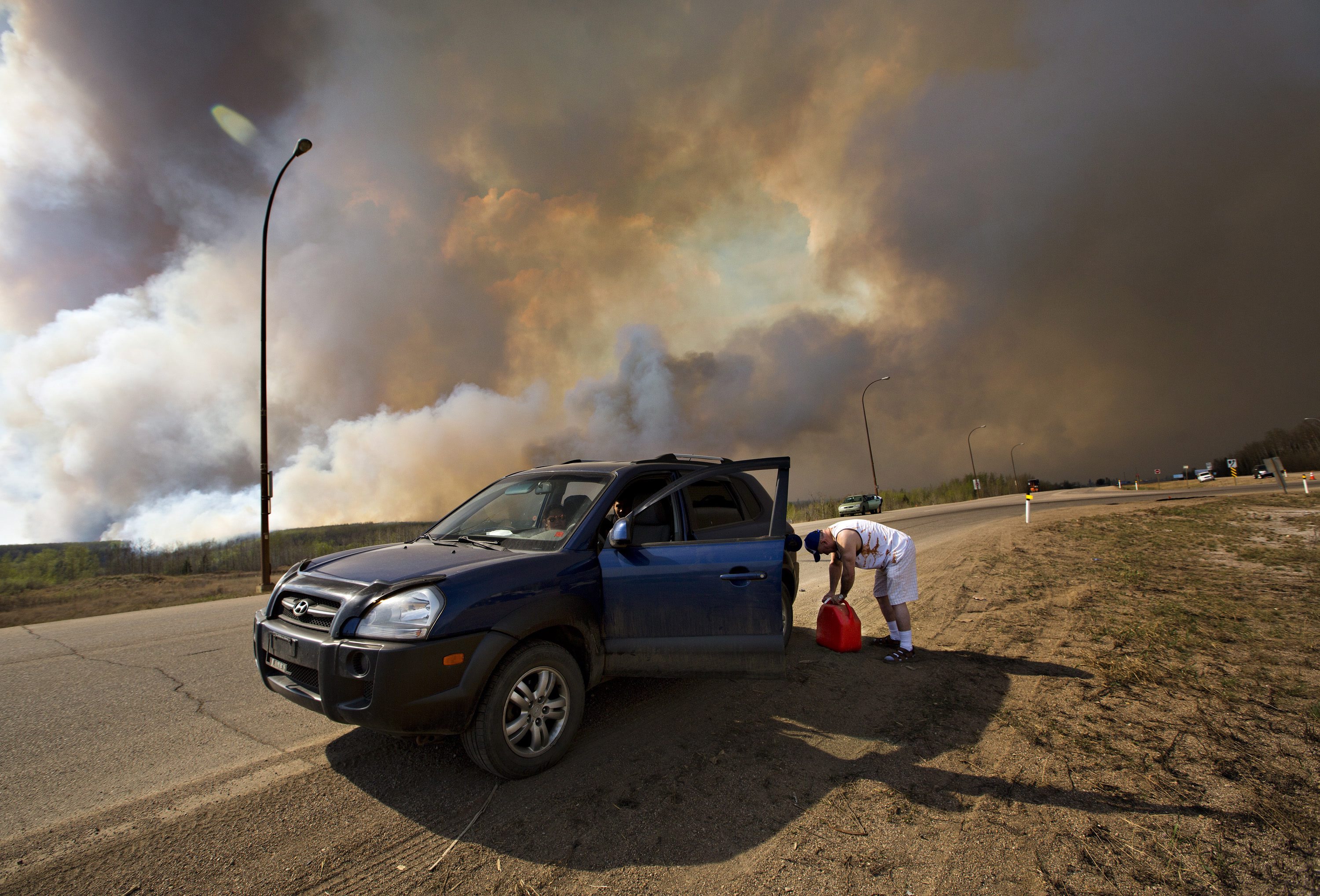 An evacuee puts gas in his car on his way out of Fort McMurray, Alberta, as a wildfire burns in the background Wednesday, May 4, 2016. The raging wildfire emptied Canada’s main oil sands city, destroying entire neighborhoods of Fort McMurray, where officials warned Wednesday that all efforts to suppress the fire have failed. (Jason Franson /The Canadian Press via AP) MANDATORY CREDIT