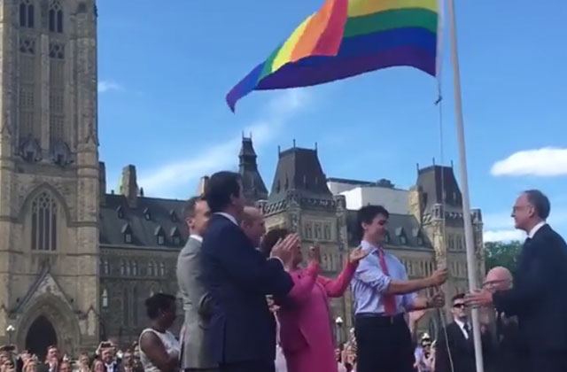 C’est via un «Facebook Live» que tous ont pu visionner ce moment historique où le drapeau multicolore de la fierté gaie a été hissé pour la première fois de l’histoire du Canada sur la colline parlementaire à Ottawa.